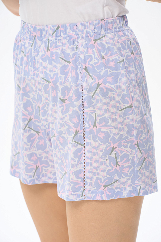 Шорты из хлопкового трикотажного полотна. Рельефные швы передних половинок декорированы мережкой. Цельнокроенный пояс с эластичной лентой внутри. Рост модели на фото 178см