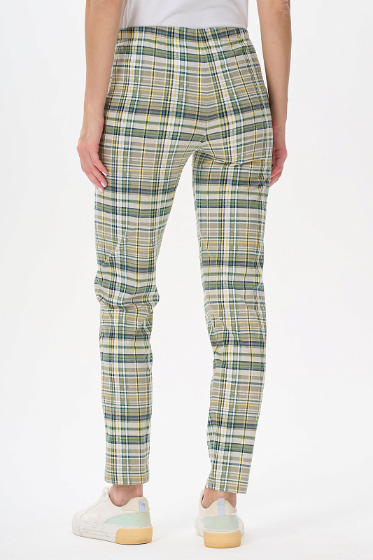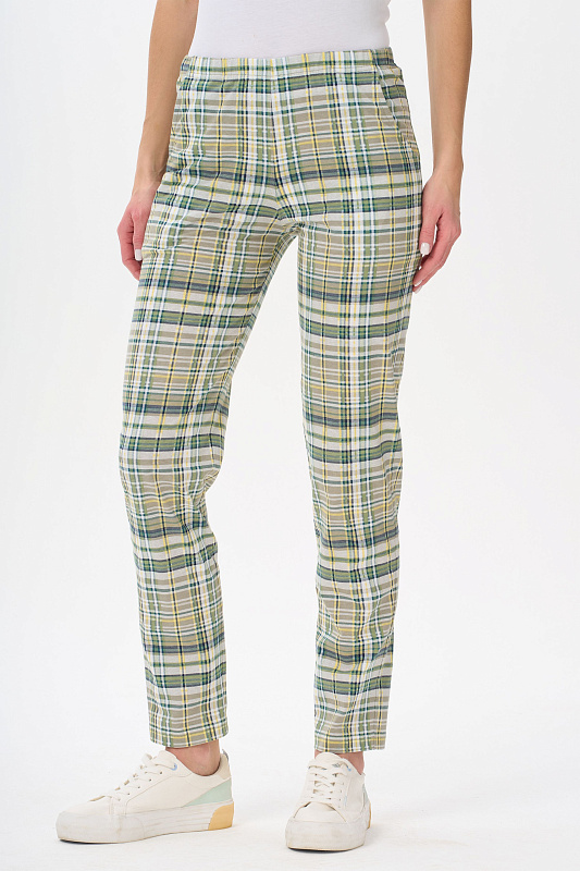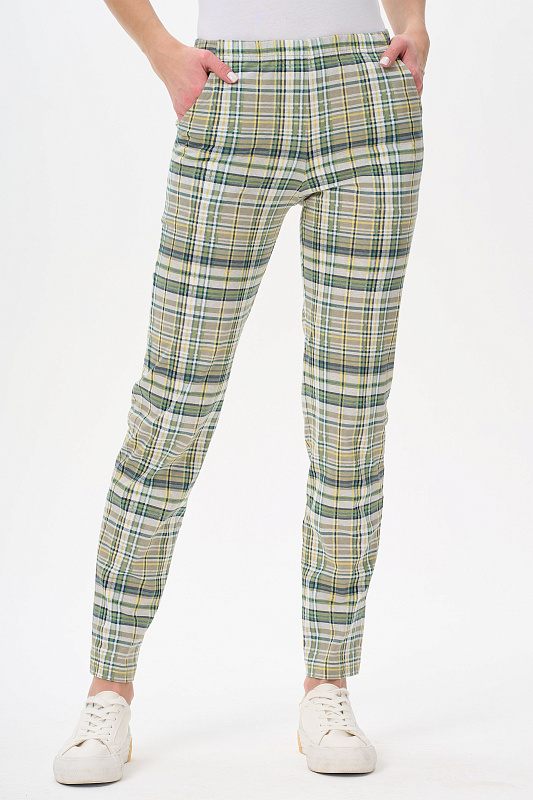 Зауженные брюки с карманами из хлопкового трикотажного полотна. Пояс с эластичной лентой внутри. Длина по боковому шву в 44 размере 103см. Рост модели на фото 178 см.