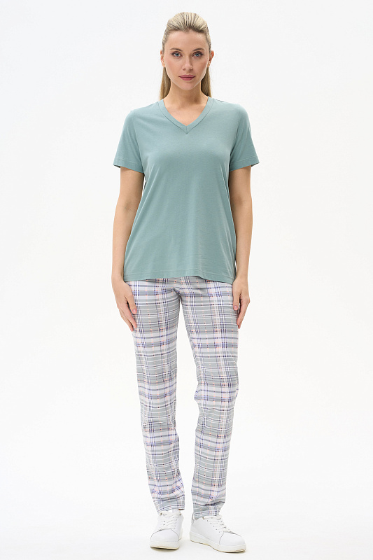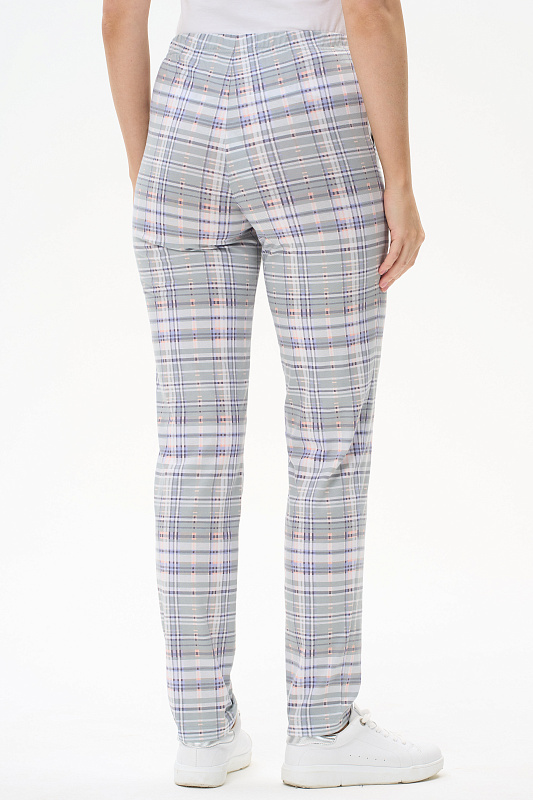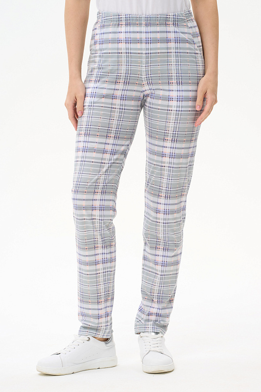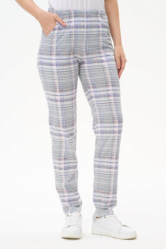 Зауженные брюки с карманами из хлопкового трикотажного полотна. Пояс с эластичной лентой внутри. Длина брюк по боковому шву в 44 размере - 103см. Рост модели 177.