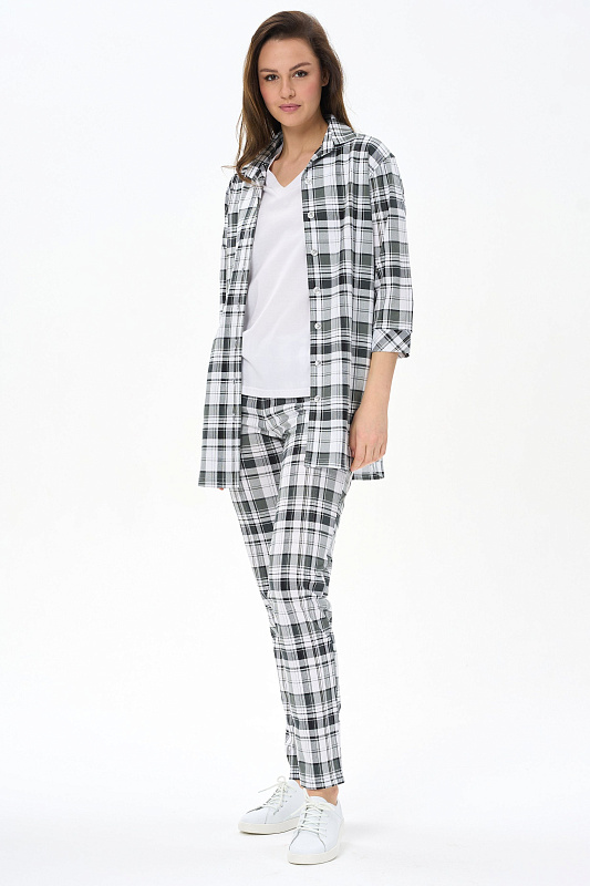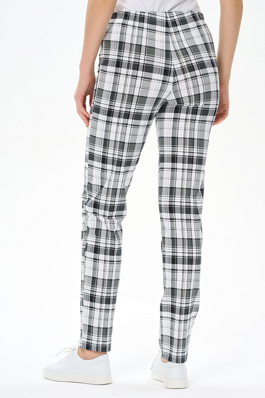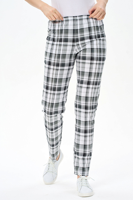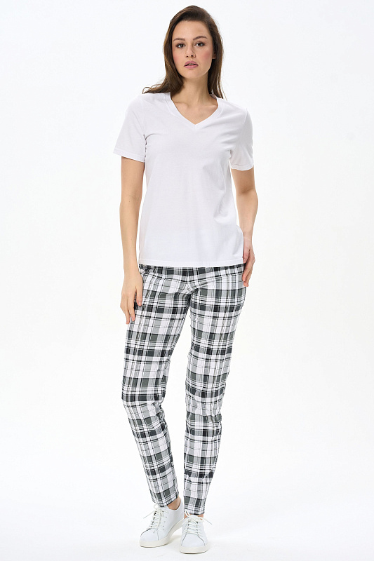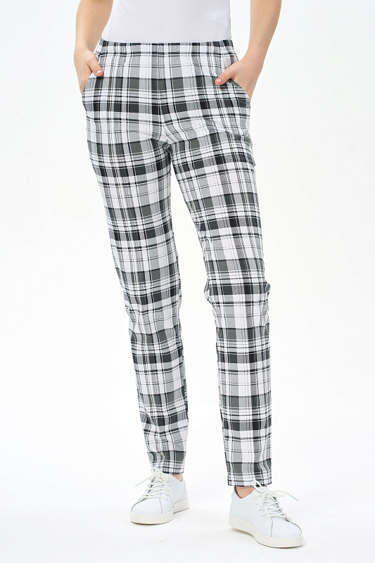 Зауженные брюки с карманами из хлопкового трикотажного полотна. Пояс с эластичной лентой внутри. Длина брюк по боковому шву в 44 размере - 103см. Рост модели 178см.