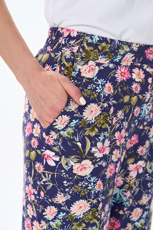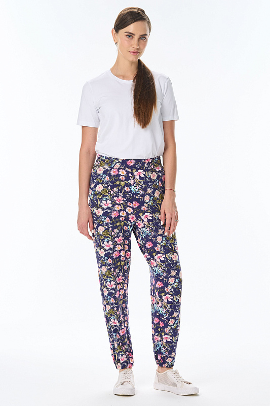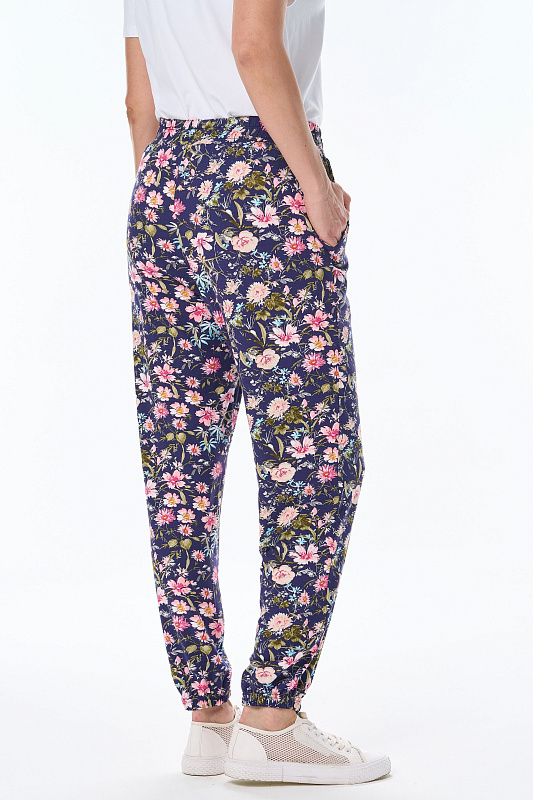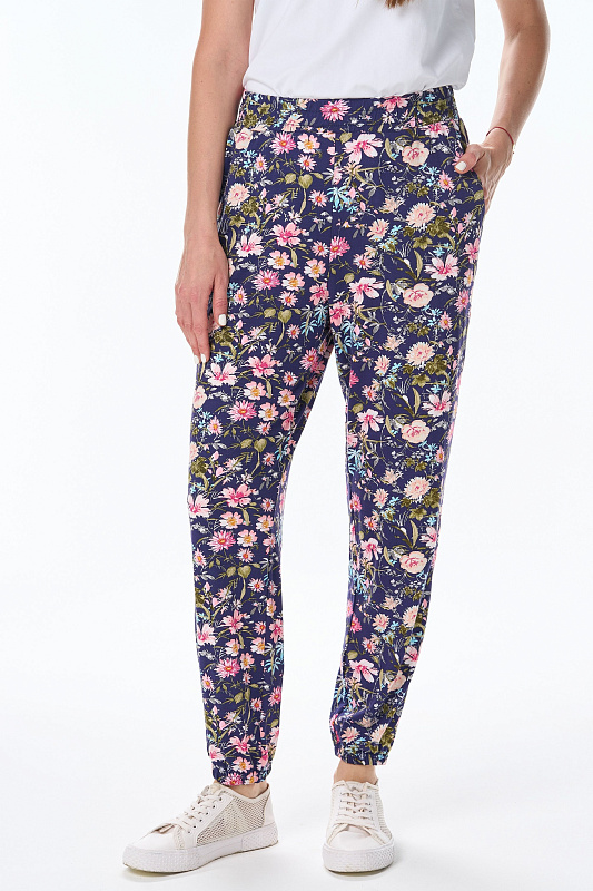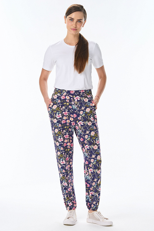 Длинные брюки из вискозного трикотажного полотна с карманами. Пояс и цельнокроенные манжеты по низу брюк с эластичной тесьмой внутри. Рост модели на фото 177см.