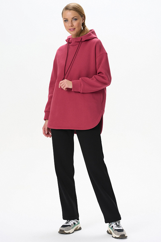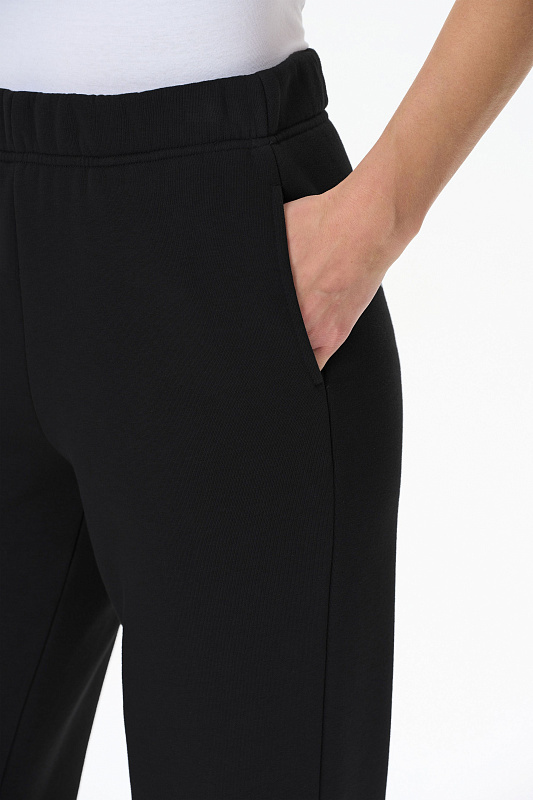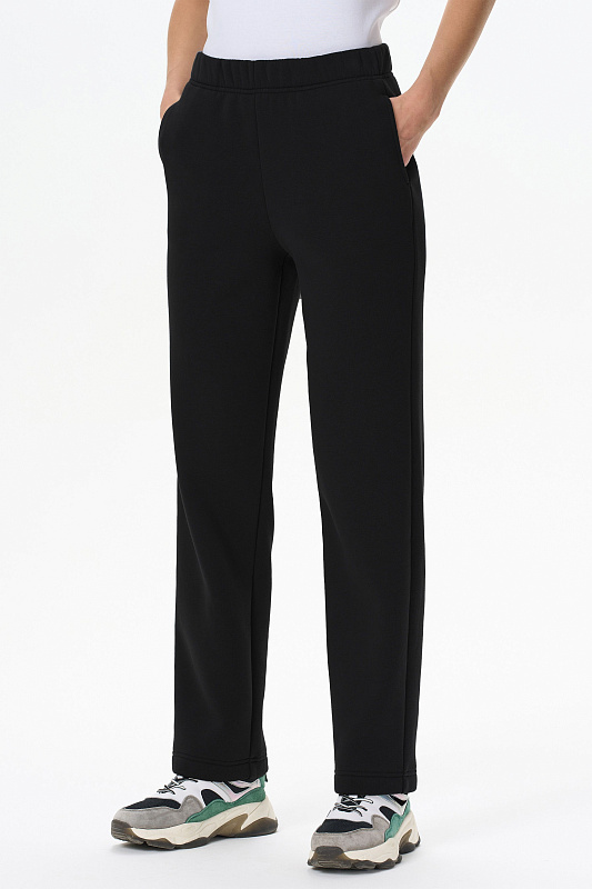 Стильные прямые брюки с карманами из хлопкового футера высокого качества 3-х нитки стриженный начес. Цельнокроеный пояс с эластичной лентой внутри. Длина брюк по боковом шву в 44 размере 107см. Рост модели на фото 177см.