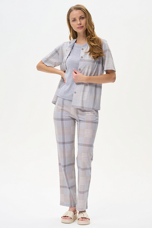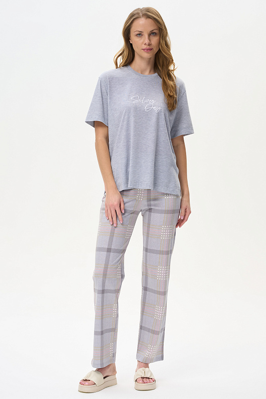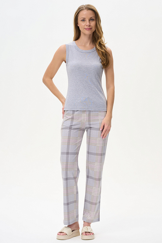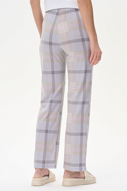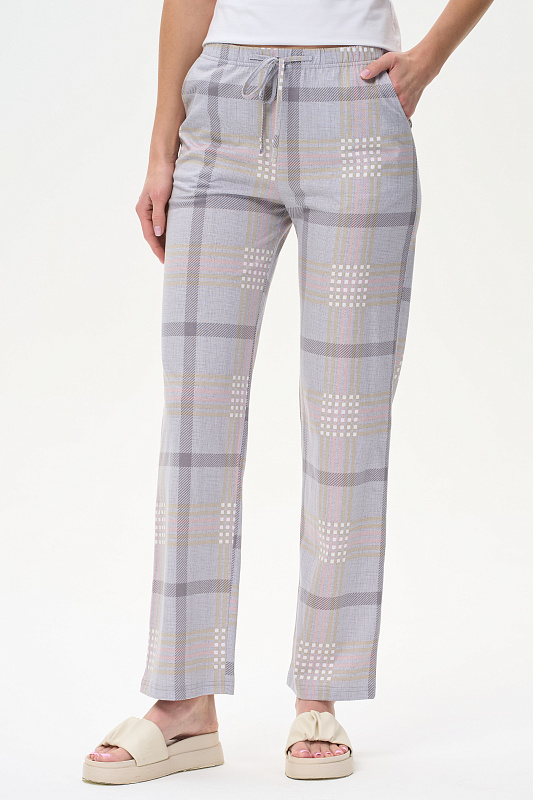 Длинные прямые брюки из хлопкового трикотажного полотна. Спереди фигурные карманы. Цельнокроенный пояс с эластичной тесьмой внутри. Рост модели на фото