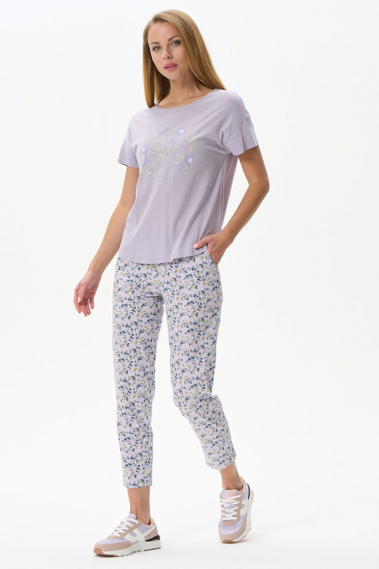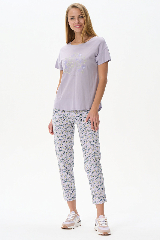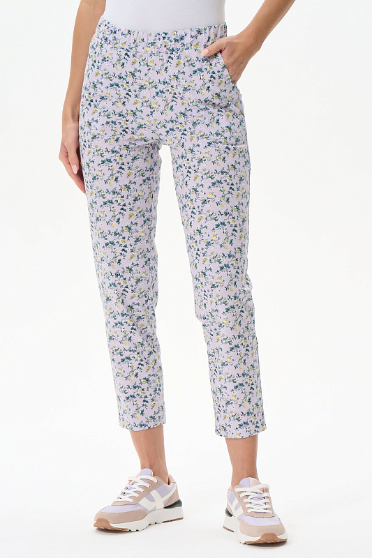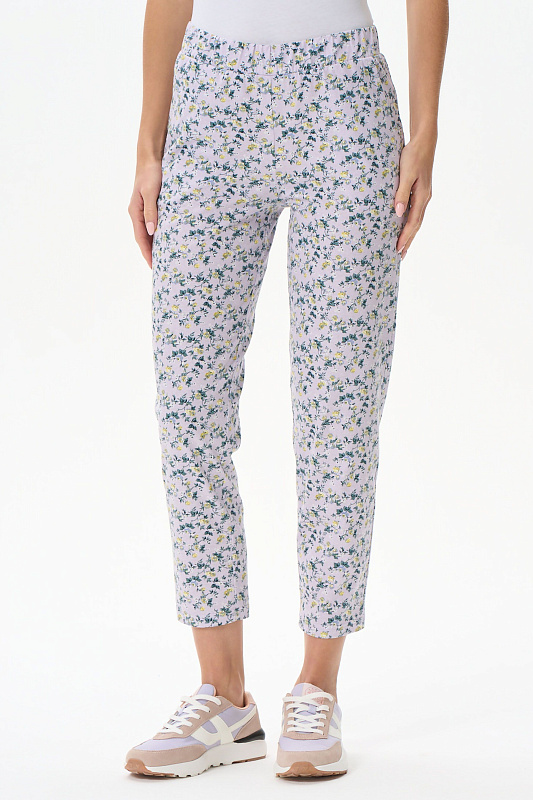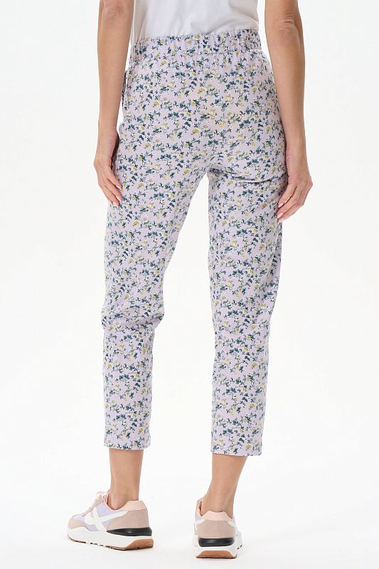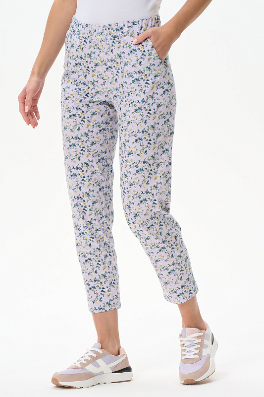 Универсальные брюки, длиной 7/8 из хлопкового полотна. Пояс с эластичной лентой, два фигурных боковых кармана. Длина брюк по боковому шву (без учета пояса) 87см. Рост модели на фото 175см.