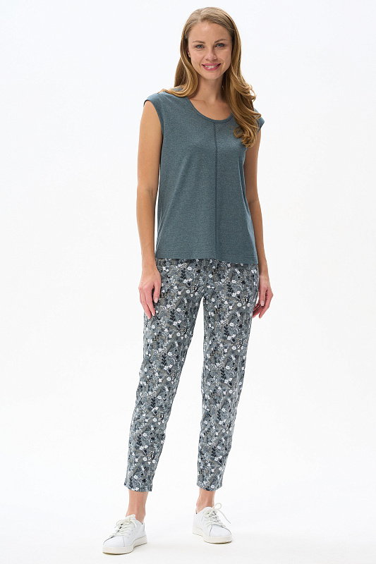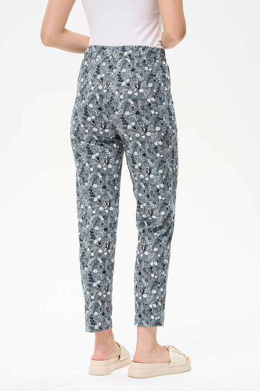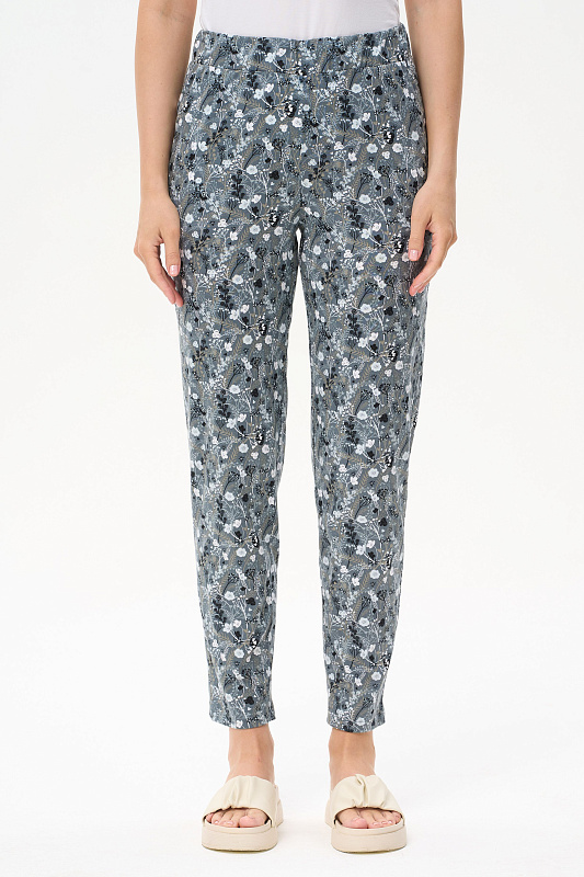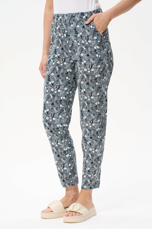 Универсальные брюки, длиной 7/8 из хлопкового полотна. Пояс с эластичной лентой, два фигурных боковых кармана. Длина по боковому шву (без учета пояса) в 44 размере 87см. Рост модели на фото 178 см.
