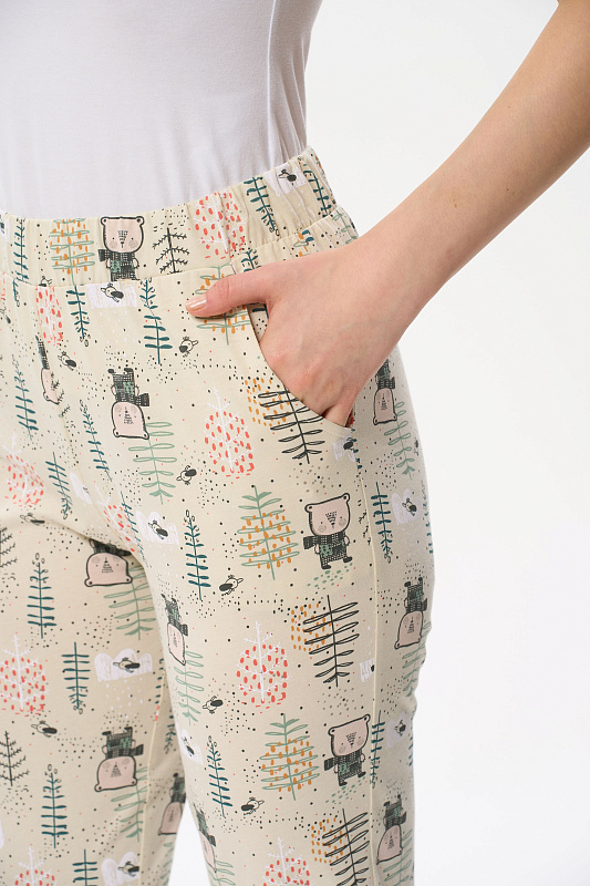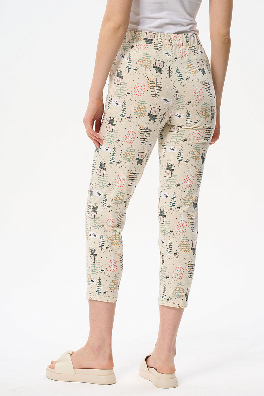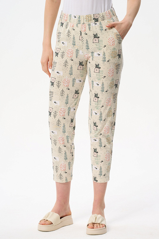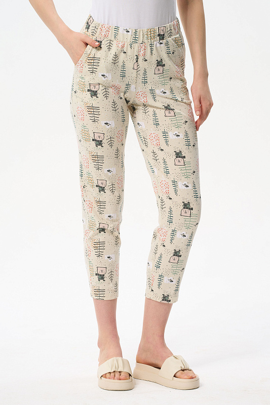 Универсальные брюки, длиной 7/8 из хлопкового полотна. Пояс с эластичной лентой, два фигурных боковых кармана. Длина по боковому шву (без учета пояса) в 44 размере 87см. Рост модели на фото 178 см.