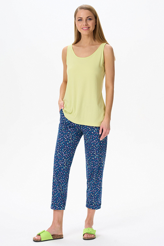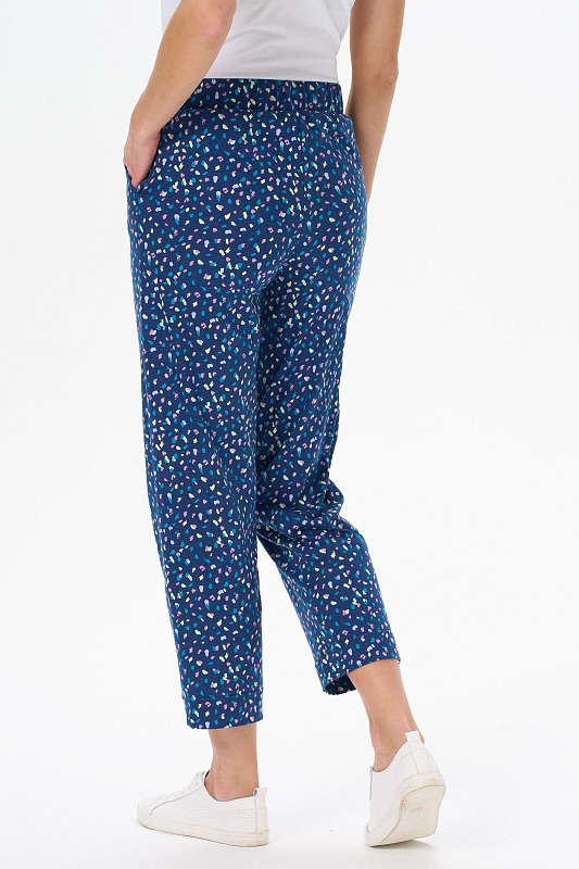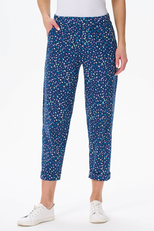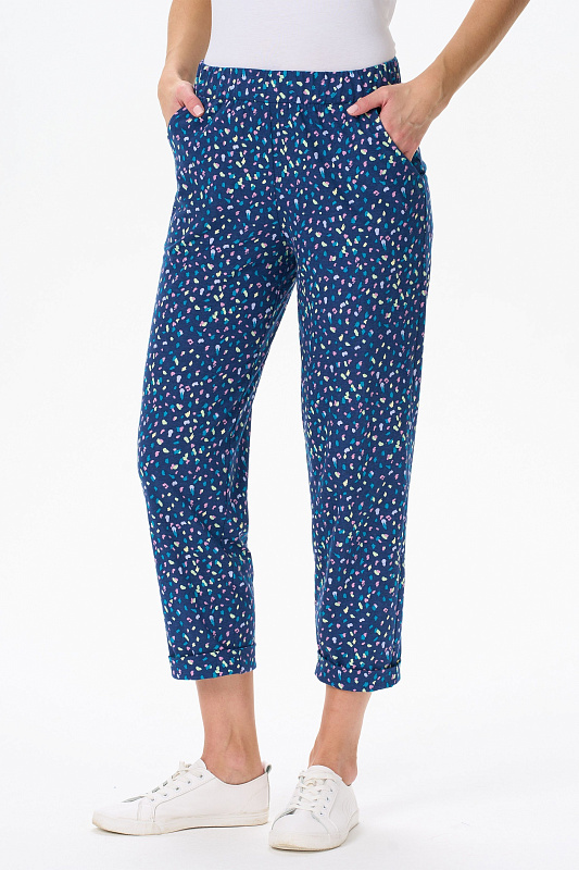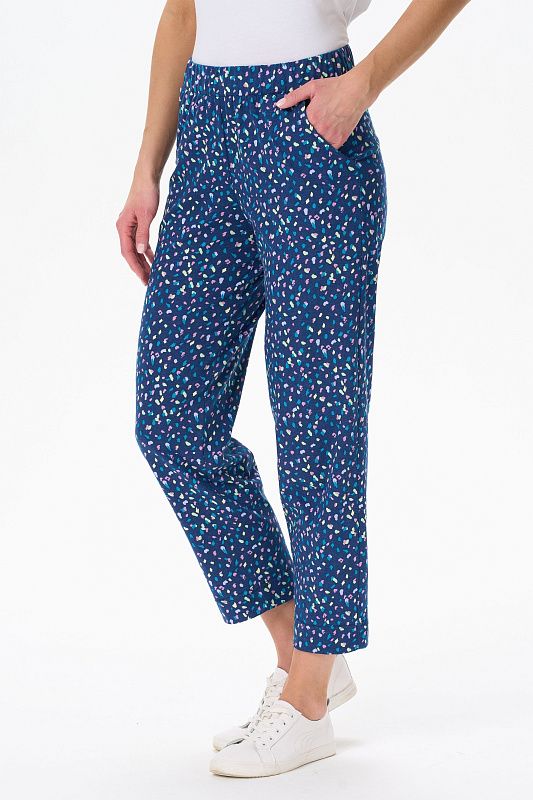 Универсальные брюки, длиной 7/8 из хлопкового полотна. Пояс с эластичной лентой, два фигурных боковых кармана. Рост модели на фото 177.