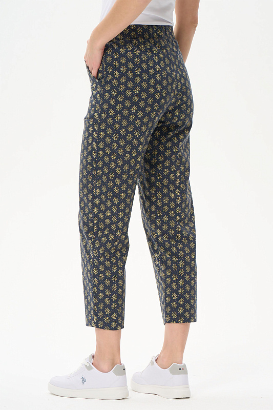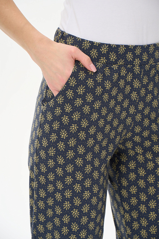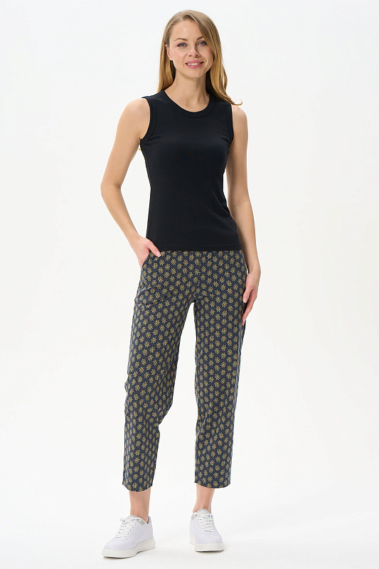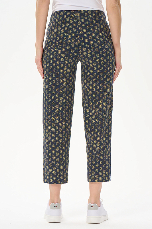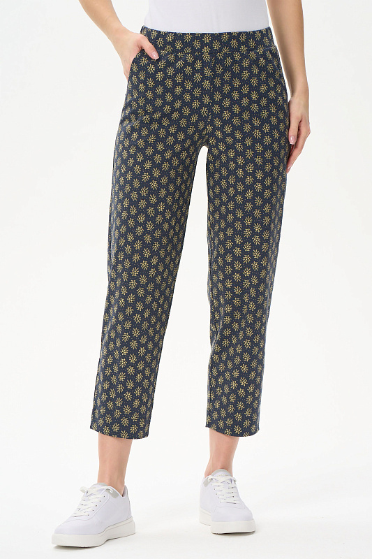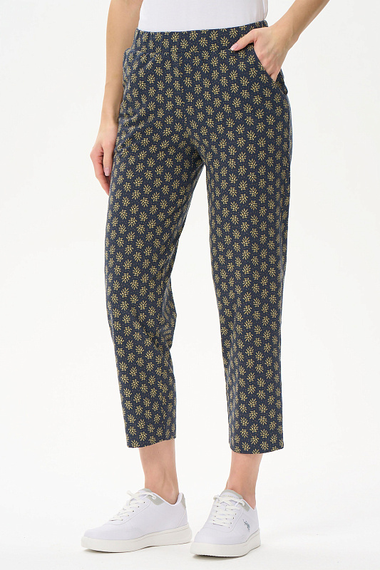 Универсальные брюки длиной 7/8 из хлопкового полотна. Пояс с эластичной лентой, два фигурных боковых кармана. Длина по боковому шву(без учета пояса) в 44 размере 87см. Рост модели на фото 178 см.