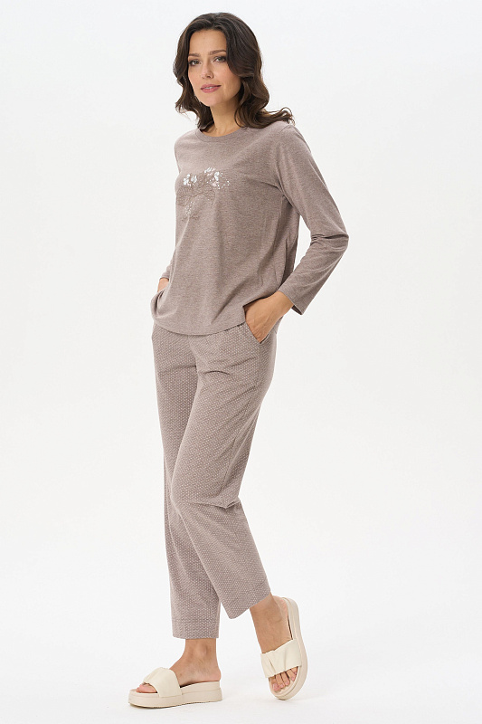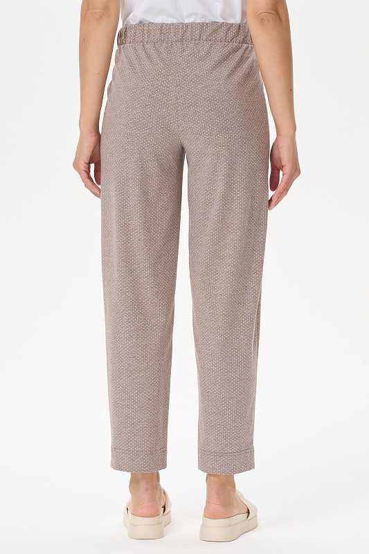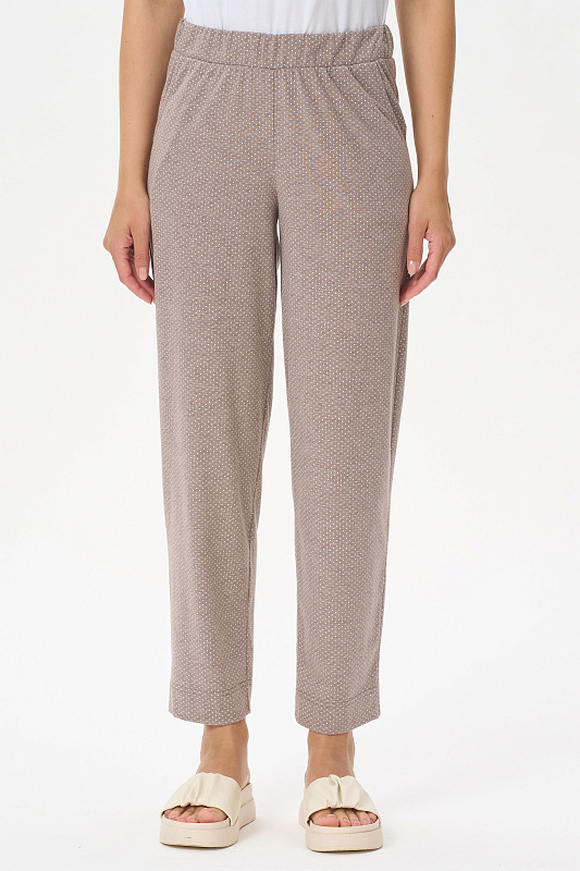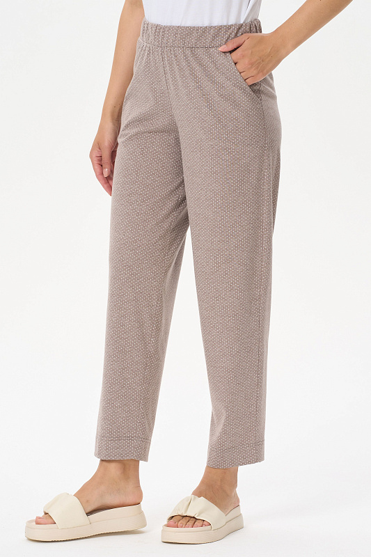 Универсальные брюки, длиной 7/8 из хлопкового меланжевого полотна. Пояс с эластичной лентой, два фигурных боковых кармана. Длина по боковому шву(без учета пояса) 87см в 44 размере. Рост модели на фото 170.
