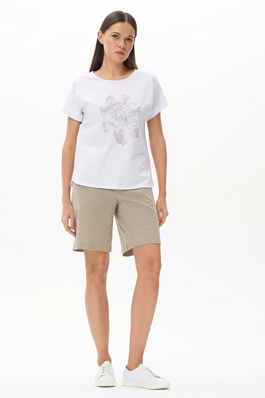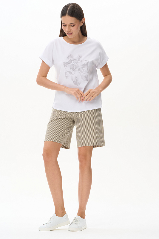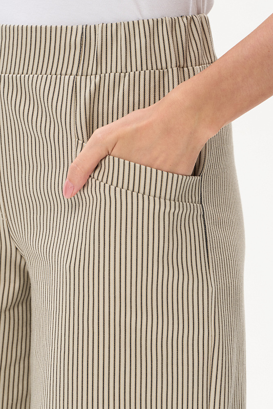 Шорты из джинскота 240 гр в в бежево-чёрную полоску. Модель с комфортным прилеганием и идеальной посадкой. Карманы с листочкой, пояс с планкой и эластичной лентой внутри. Универсальная модель для городских образов, отдыха и путешествий. Рост модели 175 см.