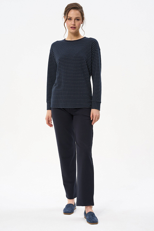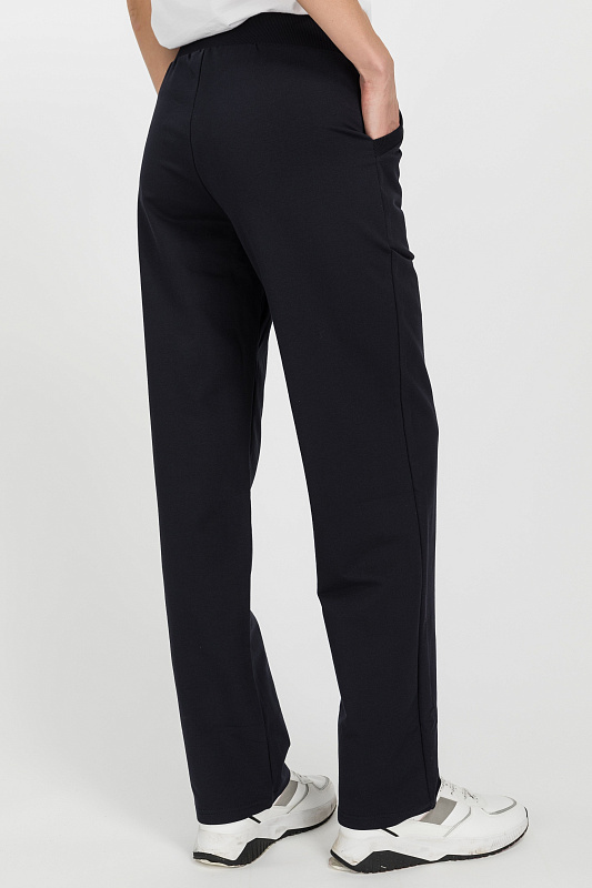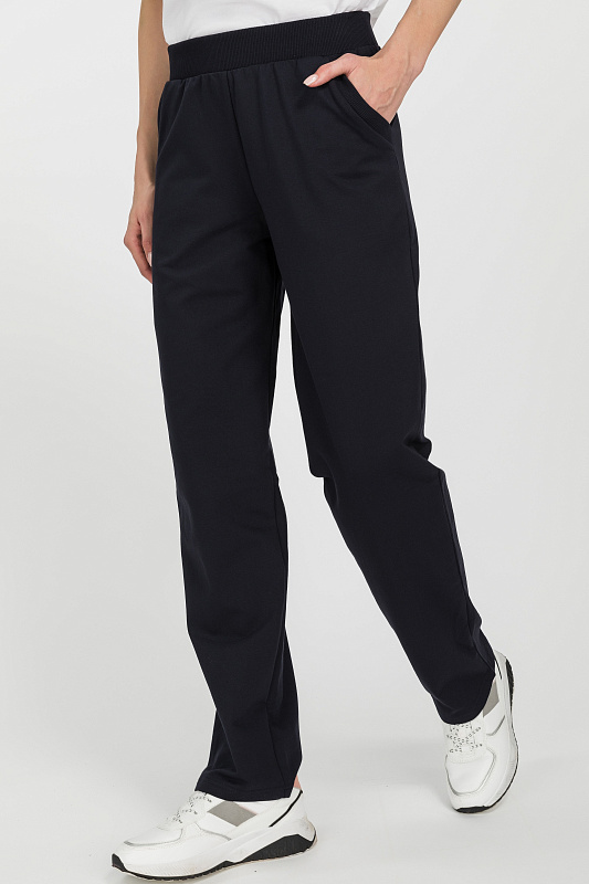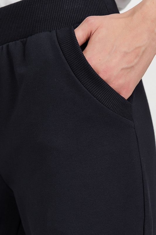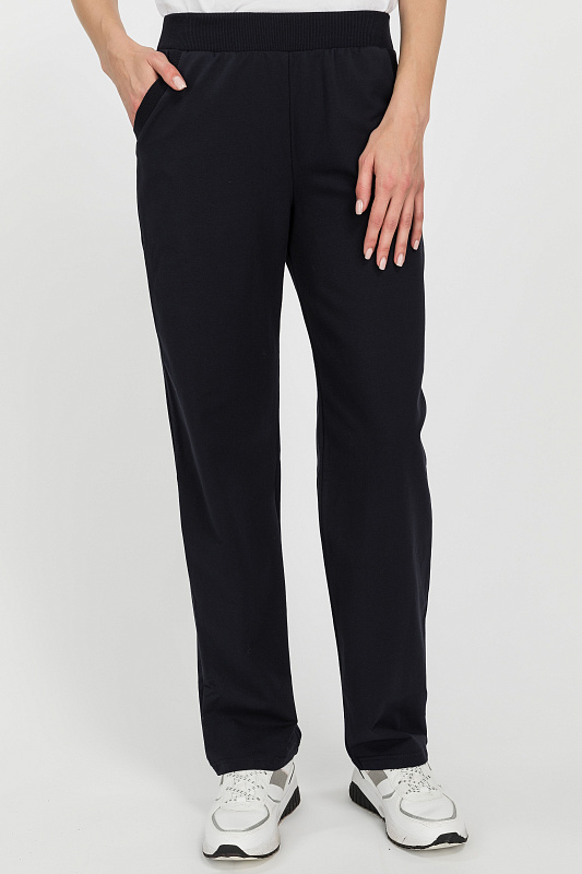 Повседневные, чуть зауженные, брюки с карманами из хлопкового футера. Пояс выполнен из кашкорсе с эластичной лентой. Фигурный вход в карман оформлен кашкорсе. Длина по боковому шву (без учета пояса) в 44 размере 100см. Рост модели на фото 177