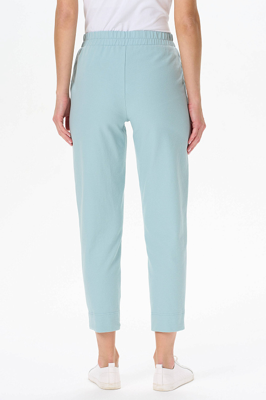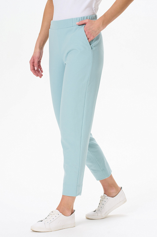 Комфортные брюки с карманами, из хлопковой трикотажной джинсы. Пояс с планкой и эластичной тесьмой внутри. По низу брюк отвороты. Рост модели 175 см.