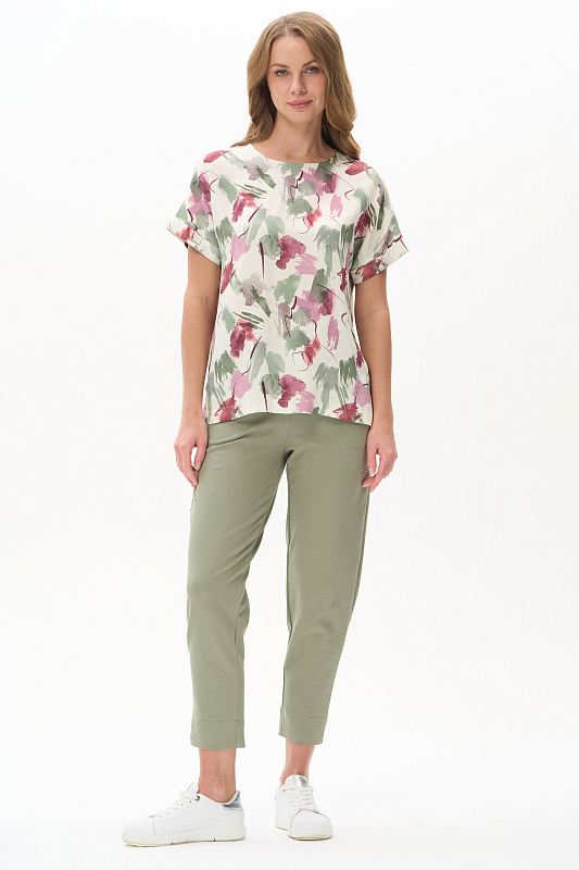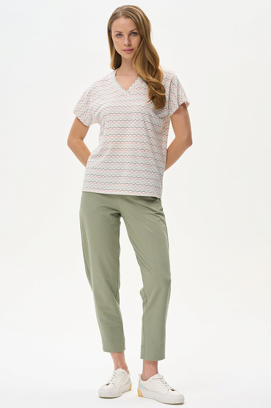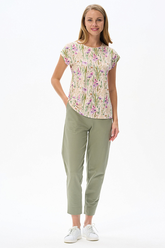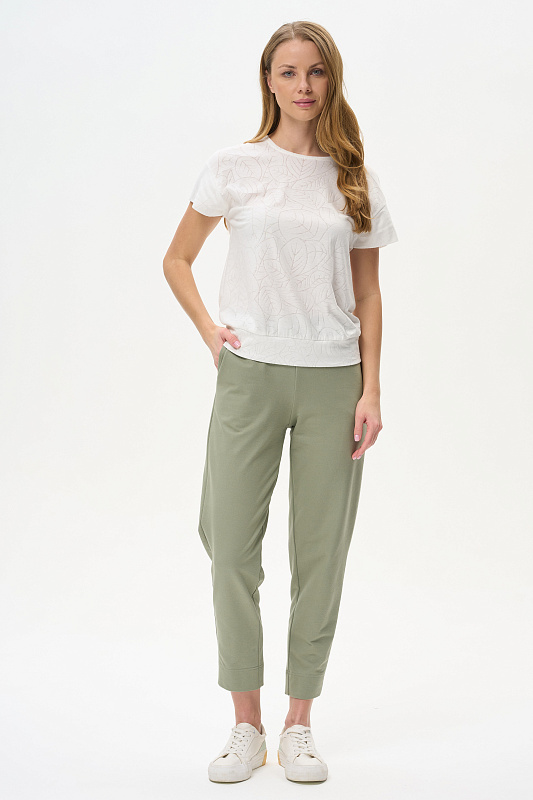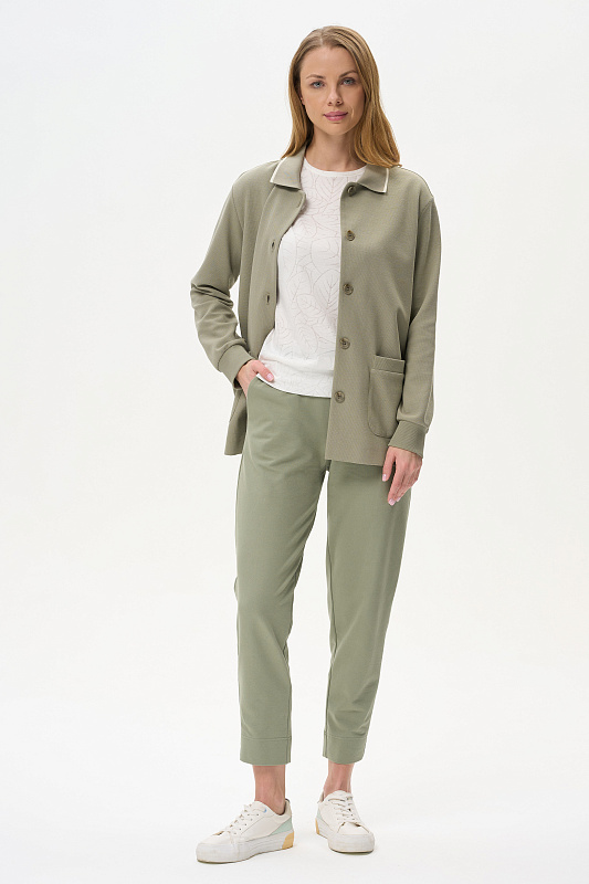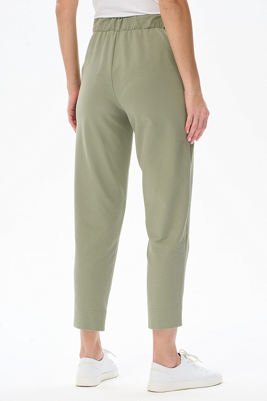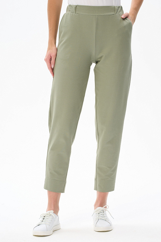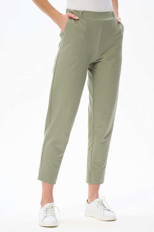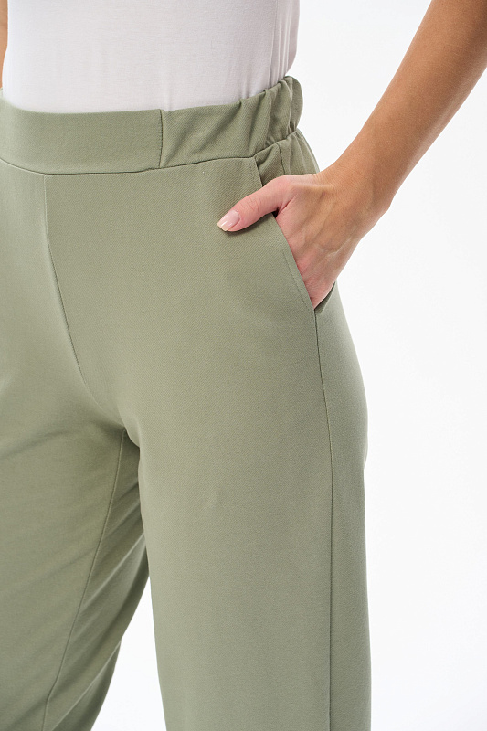 Брюки укороченные свободные из джинскота качества ПЕ 240 гр в приятном серо-зелёном оттенке. Модель с боковыми карманами, пояс с планкой и эластичной лентой внутри, по низу отвороты. Комфортная модель в актуальном силуэте для отдыха, прогулок и путешествий. Рост модели 175 см.