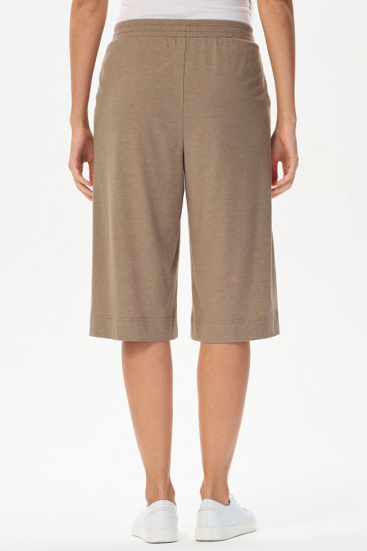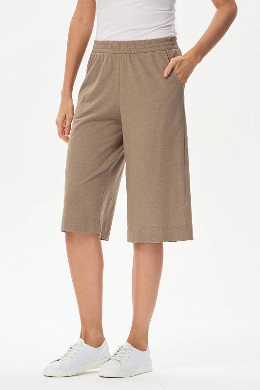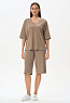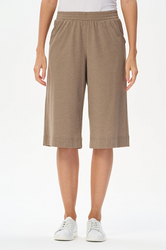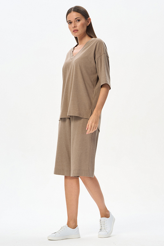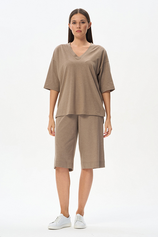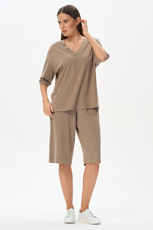 Шорты из меланжевого полотна 150 гр в тёмно-бежевом оттенке. Модель свободная, лёгкая, длиной чуть ниже колен. Удобные карманы, пояс с отстрочкой в тон и с эластичной лентой внутри. Шорты без рисунка в трендовой длине станут отличным дополнением к повседневным образам, отлично подходят для спорта и отдыха. Рост модели 175 см.