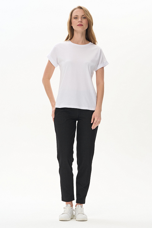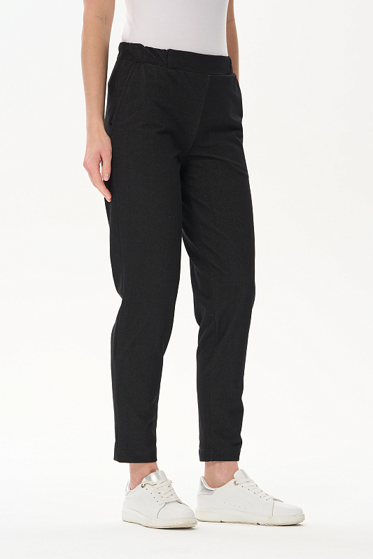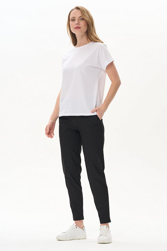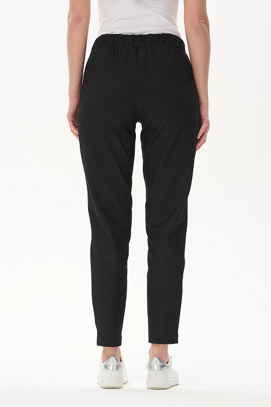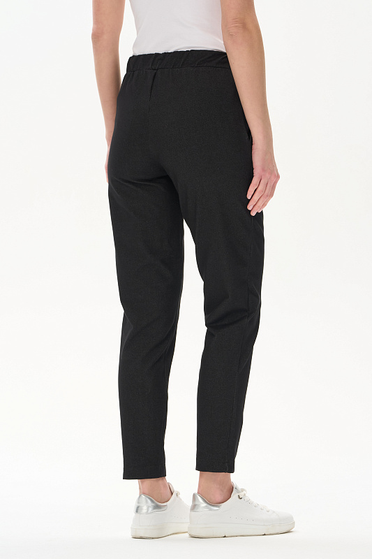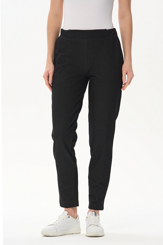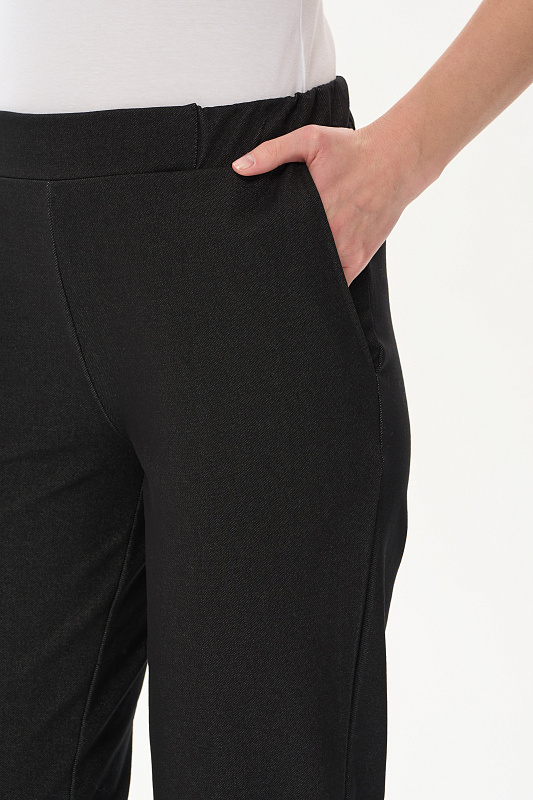 Укороченные чуть зауженные брюки из джинскота 250 гр в чёрном оттенке. Модель с классическими карманами, пояс с планкой и эластичной лентой внутри. Комфортная, универсальная модель для городских образов, отдыха и прогулок. Рост модели 175 см
