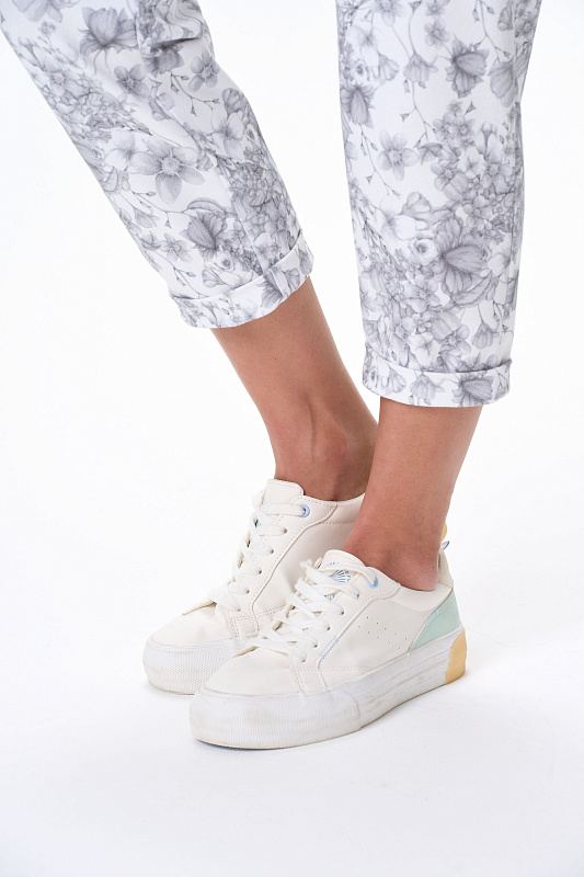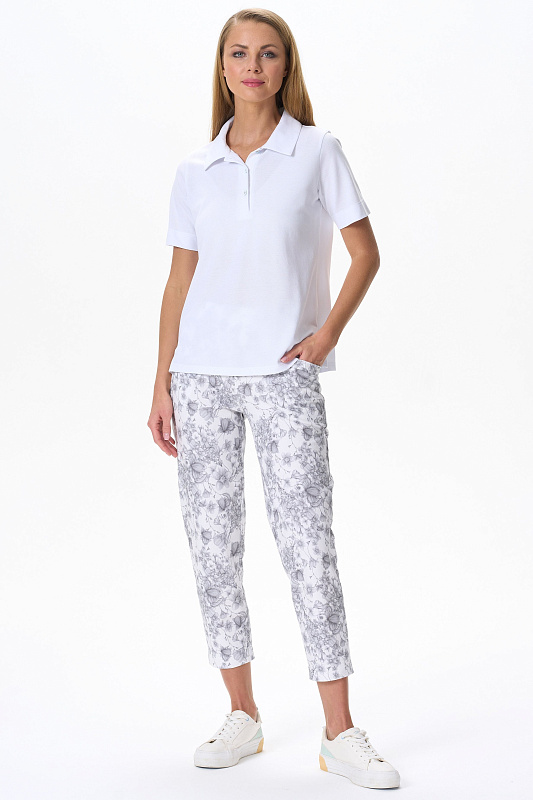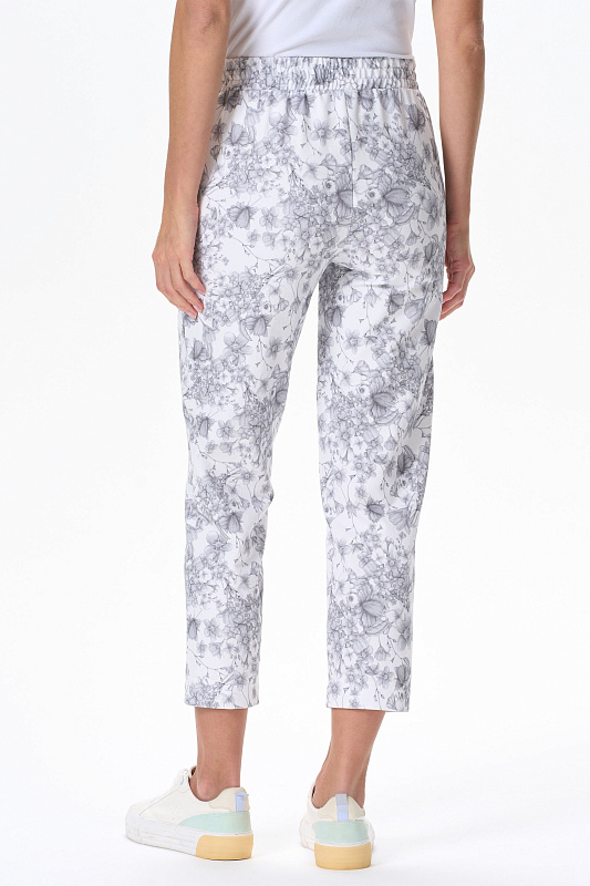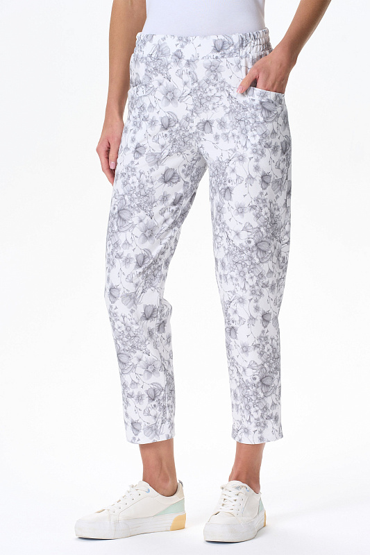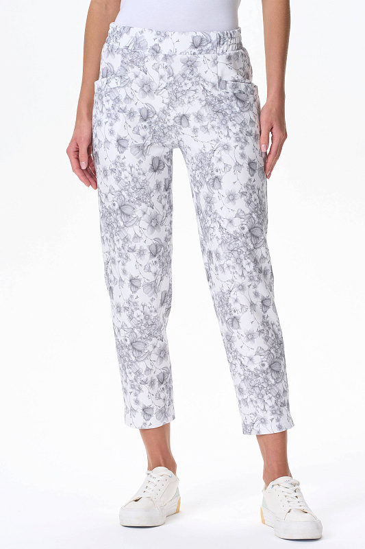 Укороченные, зауженные брюки с фигурными карманами, из хлопкового полотна джинскотт. Пояс с планкой и эластичной тесьмой внутри. Длина по боковому шву(без пояса) 87см. Рост модели на фото 177.