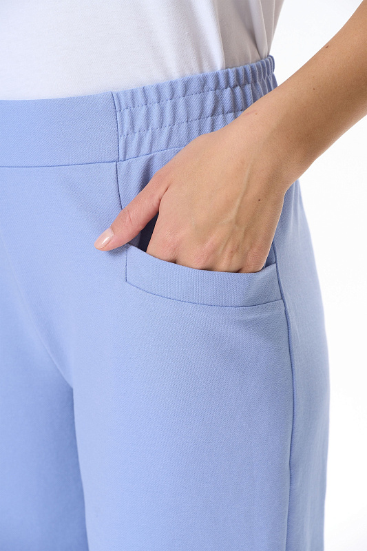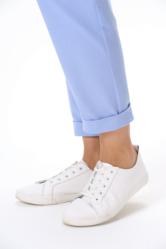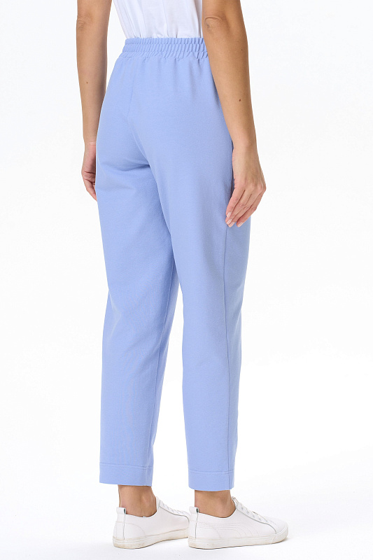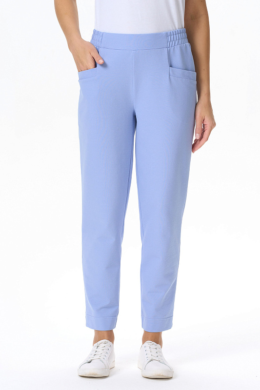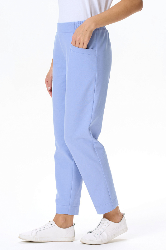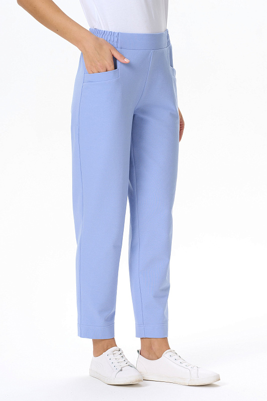 Укороченные, зауженные брюки с фигурными карманами, из хлопкового полотна джинскотт. Пояс с планкой и эластичной тесьмой внутри. Длина по боковому шву(без пояса) 87см. Рост модели на фото 177.
