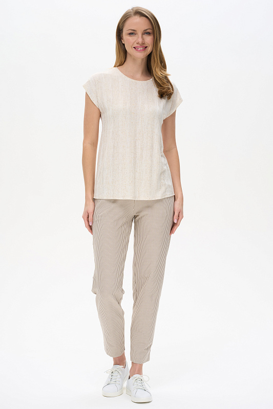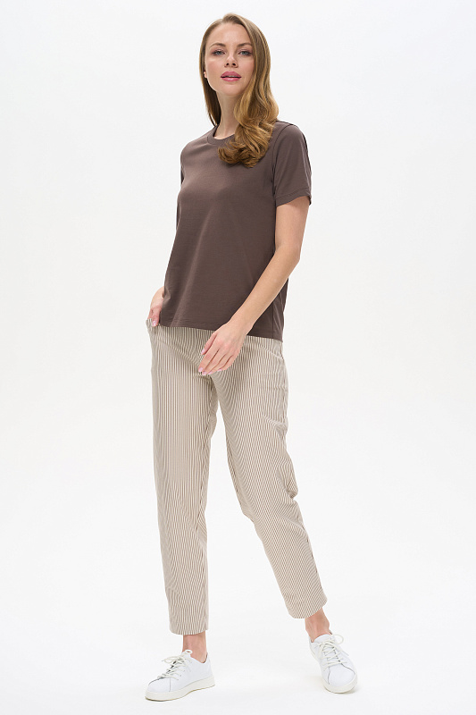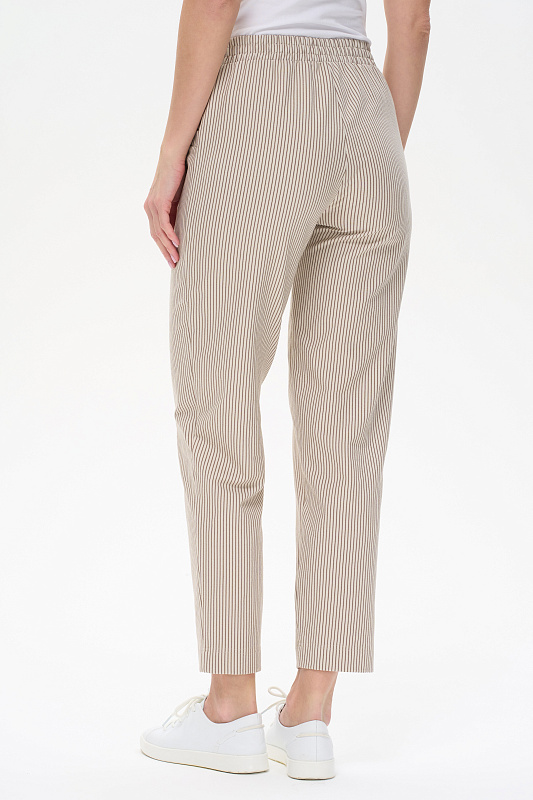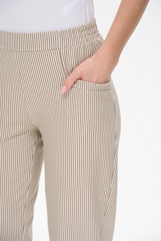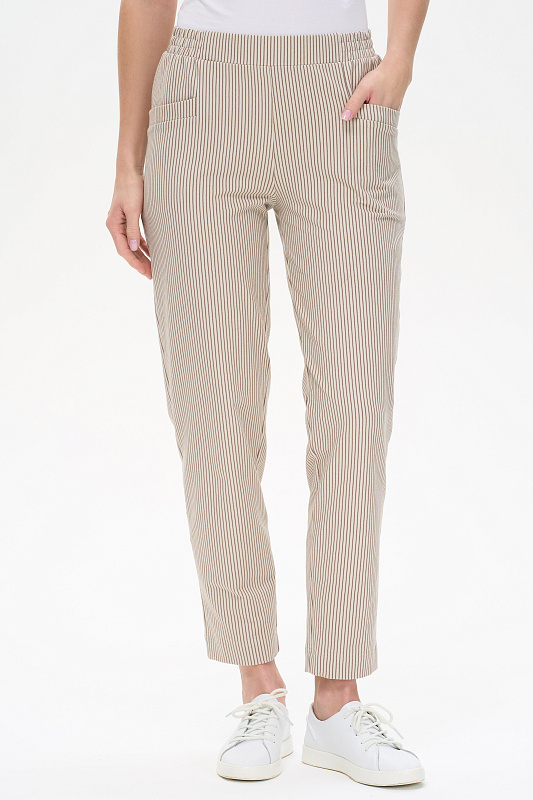 Укороченные, зауженные брюки с фигурными карманами, из хлопкового полотна джинскотт. Пояс с планкой и эластичной тесьмой внутри. Длина по боковому шву(без пояса) 87см. Рост модели на фото 177.