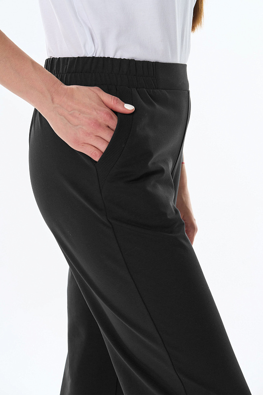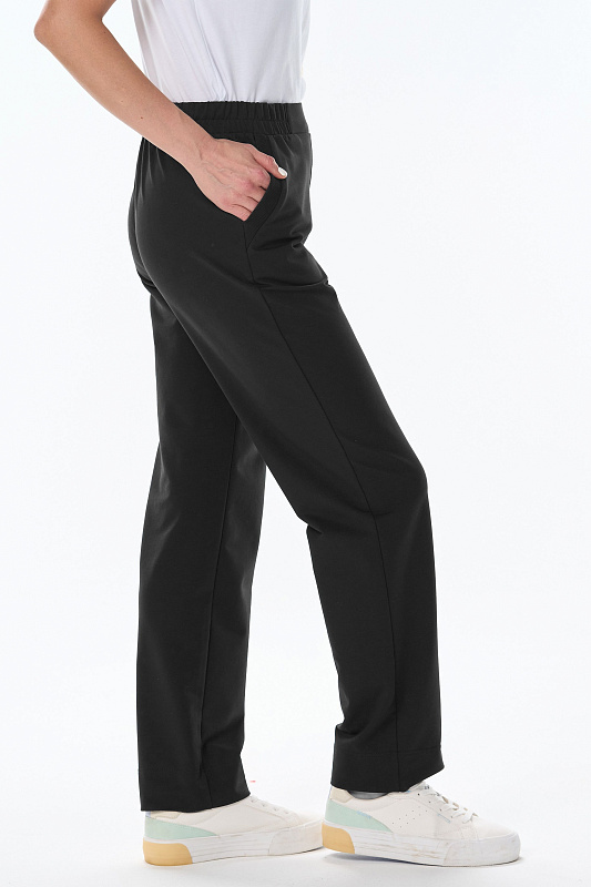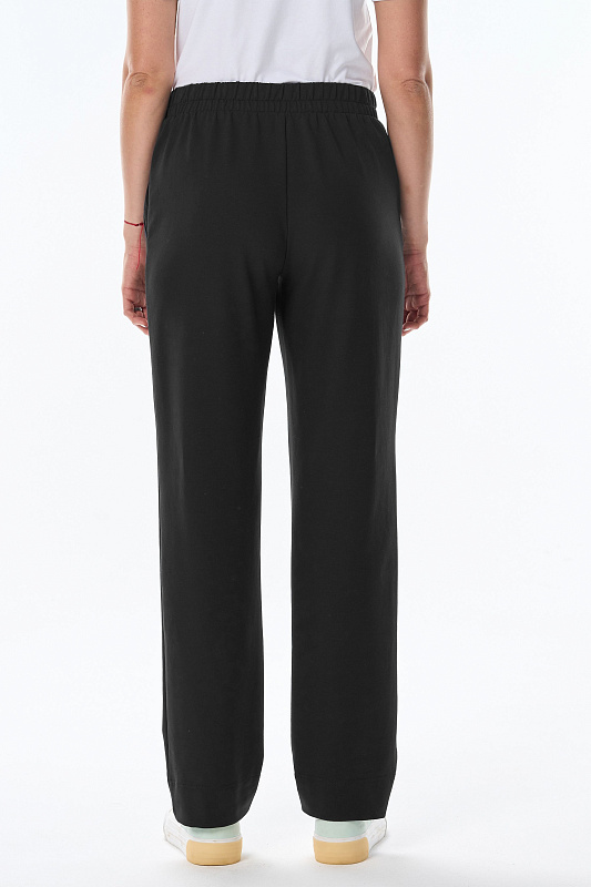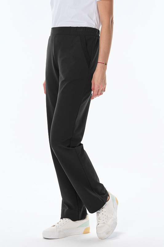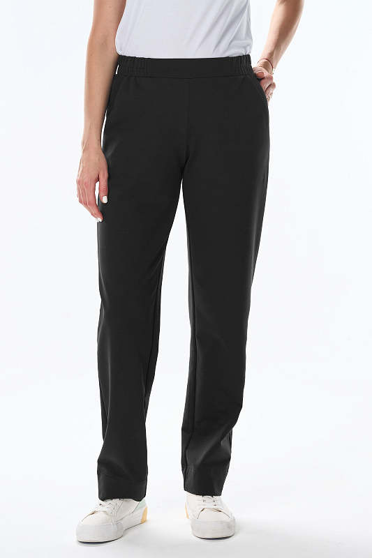 Повседневные, прямые, брюки с карманами из хлопкового футера. Пояс с планкой и эластичной лентой внутри. Фигурный вход в карман оформлен кашкорсе. Длина брюк по боковому шву (без пояса) в 44 размере 100см. Рост модели на фото 177