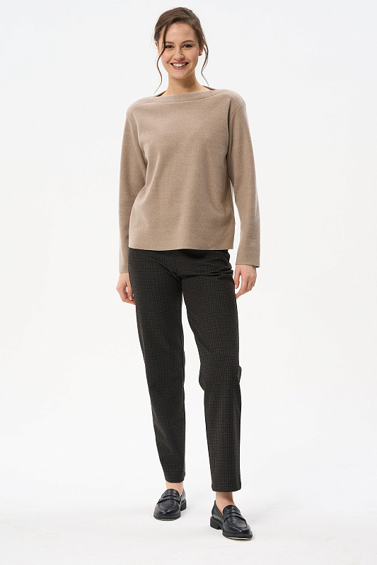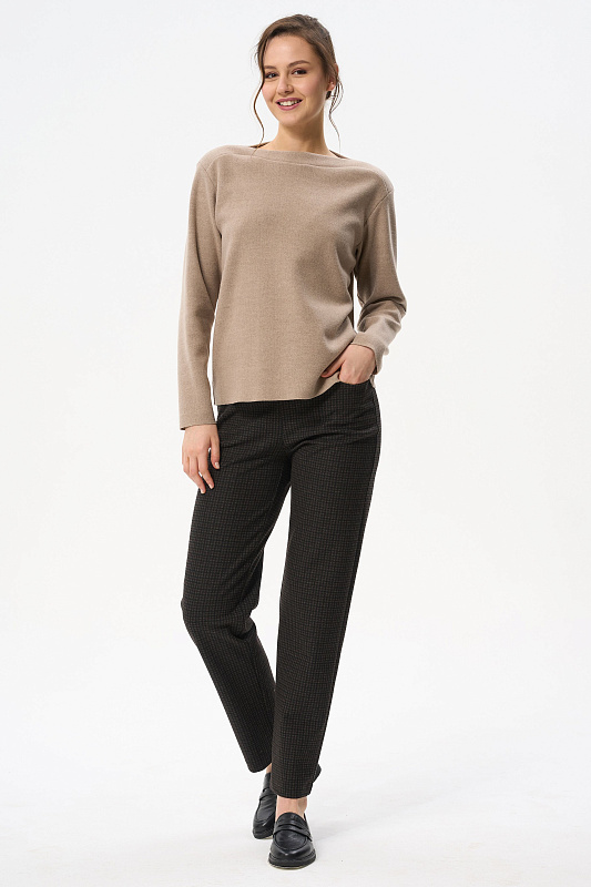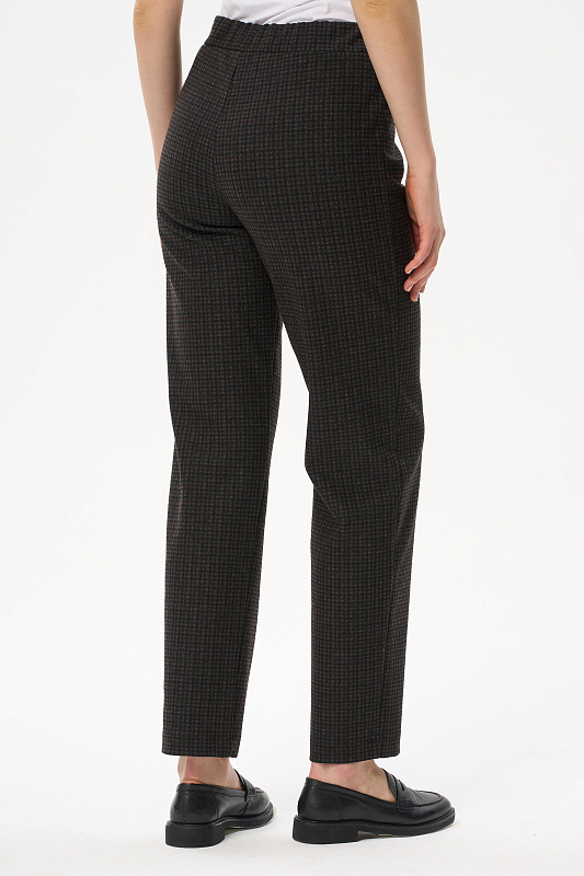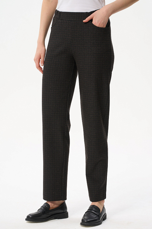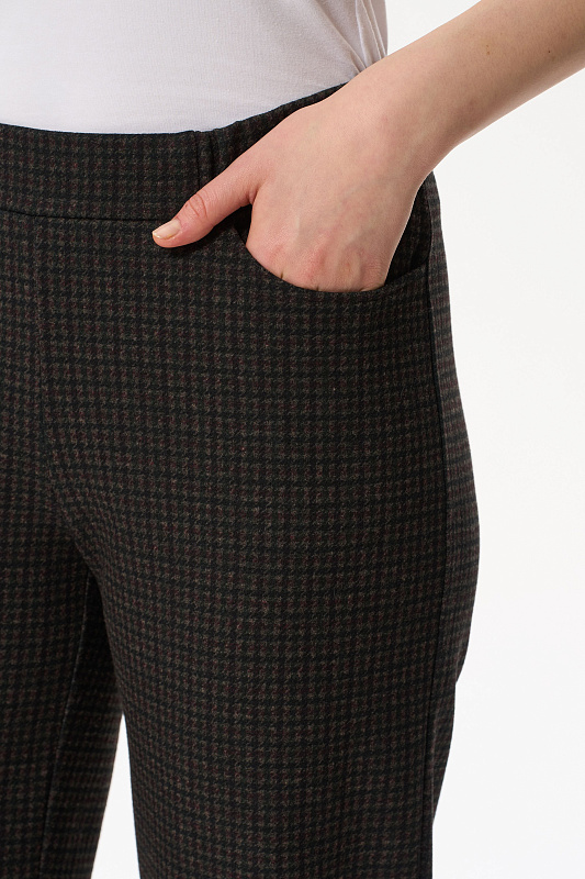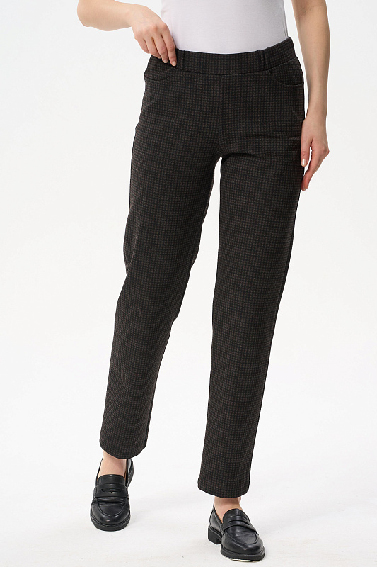 Утепленные чуть зауженные к низу брюки. Выполнены из плотного трикотажного полотна- бистрейч. Пояс с эластичной лентой внутри. Спереди два фигурных кармана. Длина по боковому шву в 44 размере 97см. Рост модели на фото 178 см.
