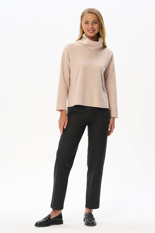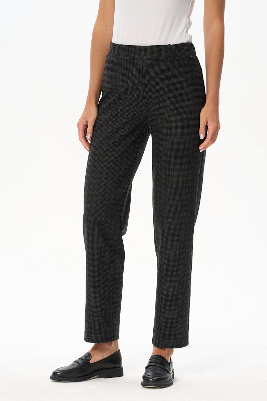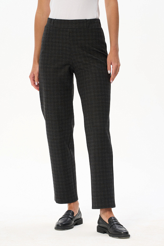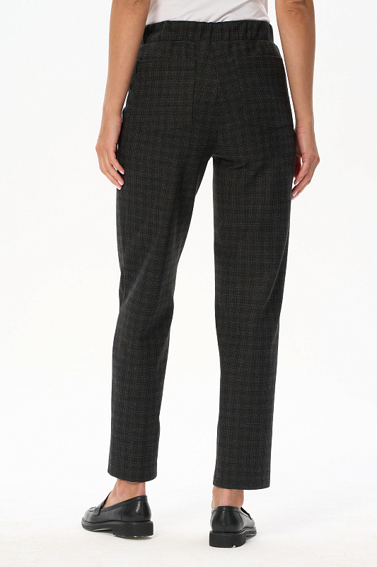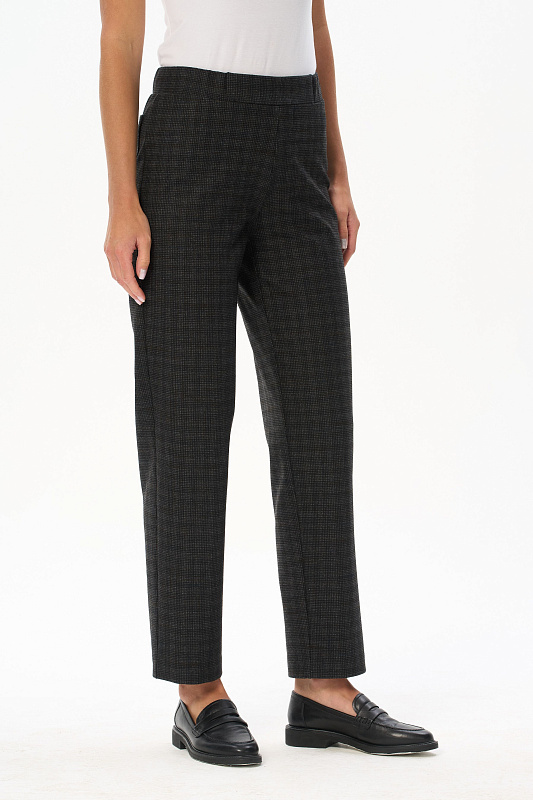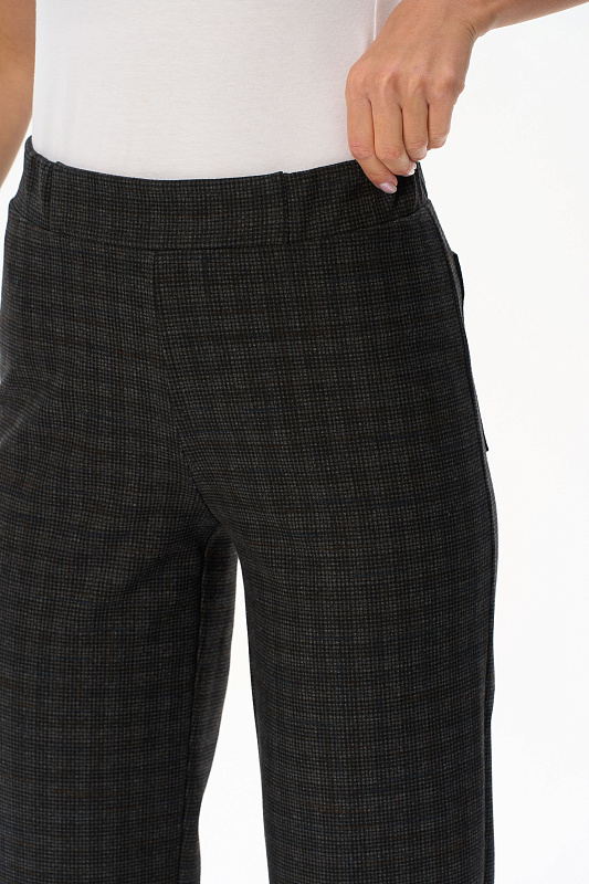 Утепленные чуть зауженные к низу брюки. Выполнены из плотного трикотажного полотна- бистрейч. Пояс с эластичной лентой внутри. Спереди два фигурных кармана. Длина по боковому шву в 44 размере 97см. Рост модели на фото 175