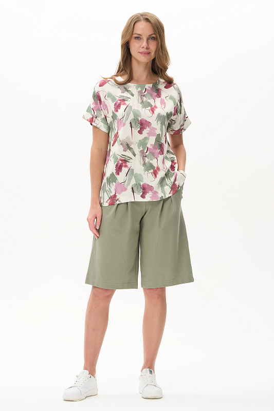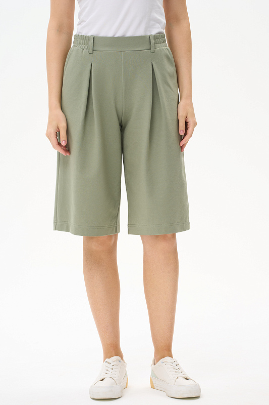 Шорты из джинскота качества ПЕ 240 гр в приятном серо-зелёном оттенке, длиной до колен с двумя небольшими складками, которые создают модный силуэт. В боковых швах карманы, пояс с эластичной лентой внутри. Модель точно сидит на талии. Рост модели 175 см.