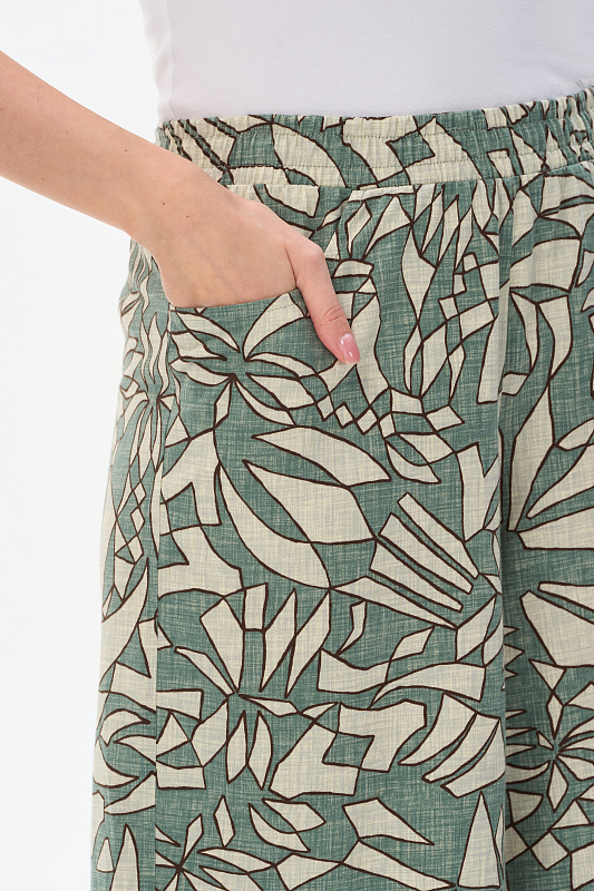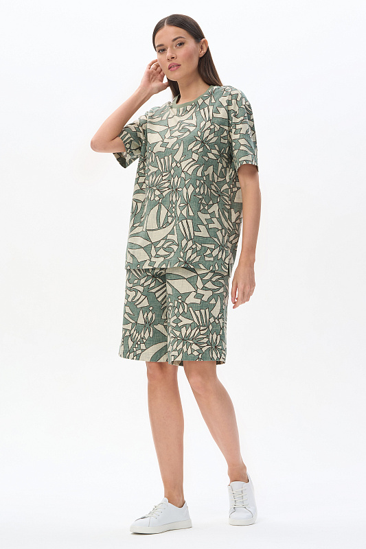 Легкие шорты длиной до колен из кулирки 150 гр Абстрактный рисунок в оттенках коллекции. Модель с удобными карманами, пояс с эластичной лентой внутри. В паре с футболкой из того-же полотна создают стильный комплект для отдыха, дома и путешествий. Рост модели 175 см.