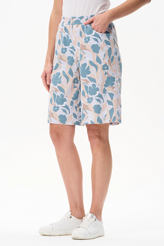Легкие шорты длиной до колен из кулирки 150 гр c дизайнерским рисунком - Цветочная абстракция. Модель с удобными карманами, пояс с эластичной лентой внутри. Отличная модель для отдыха. Рост модели 175 см.