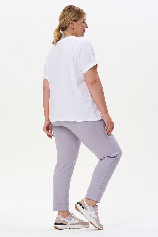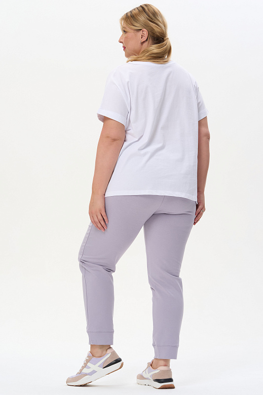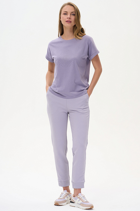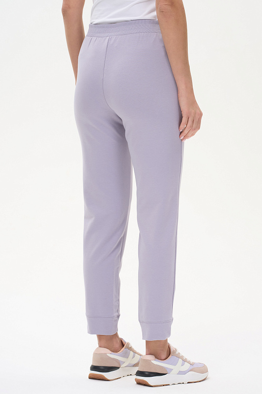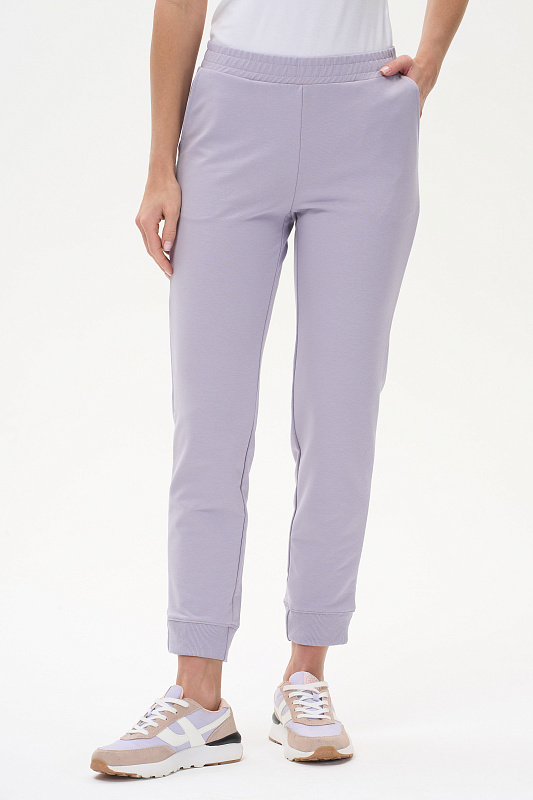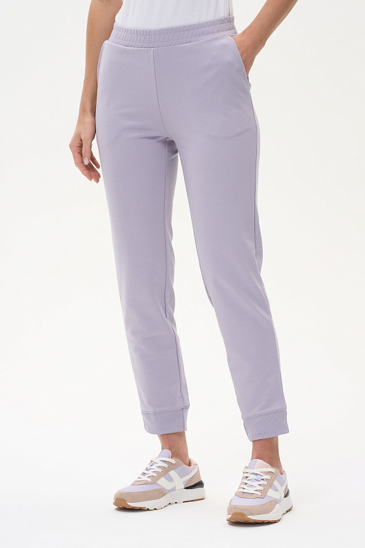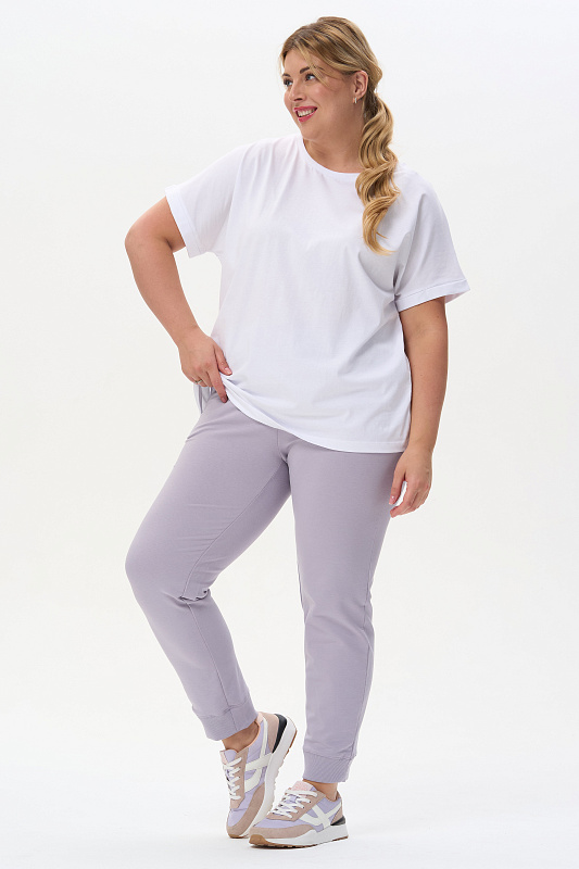 Модные брюки классической формы из хлопкового футера с эластаном 240 гр в красивом Лавандовом оттенке. Модель с боковыми карманами, отрезной пояс с отстрочкой и эластичной лентой внутри. Отделка из кашкорсе в тон полотна расположена по передней части манжета и задней части пояса на брюках. Длина по боковому шву в 44 р - 98см Рост модели 175 см.