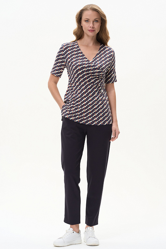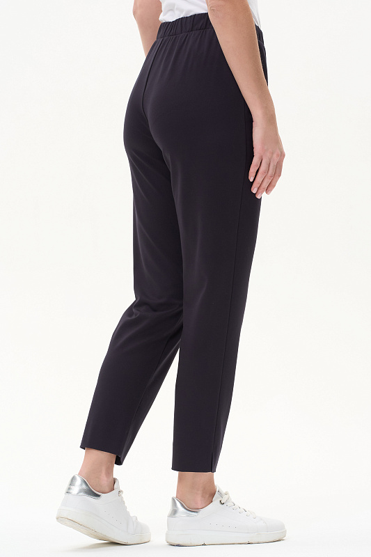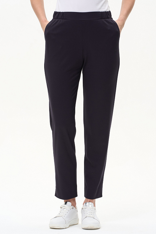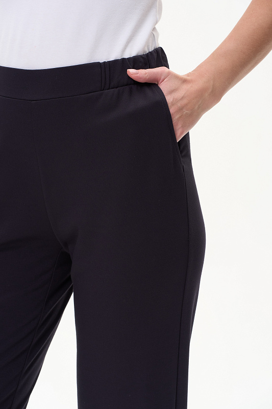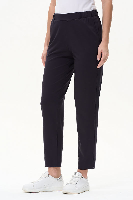 Брюки полной длины чуть зауженные к низу, с небольшими разрезами по низу, из мягкого пластичного полотна 260 гр в глубоком синем оттенке. Спереди небольшие складки и карманы, пояс с эластичной лентой внутри. Комфортная, универсальная модель для офиса и особых случаев. Рост модели 175 см