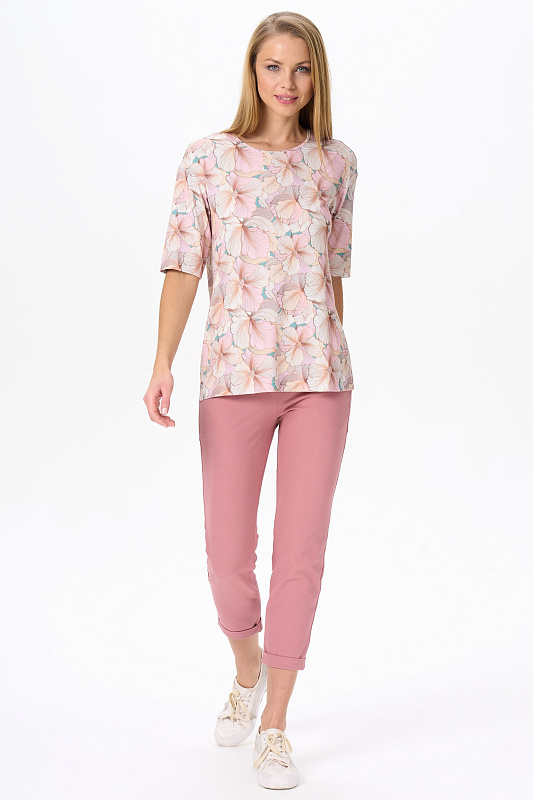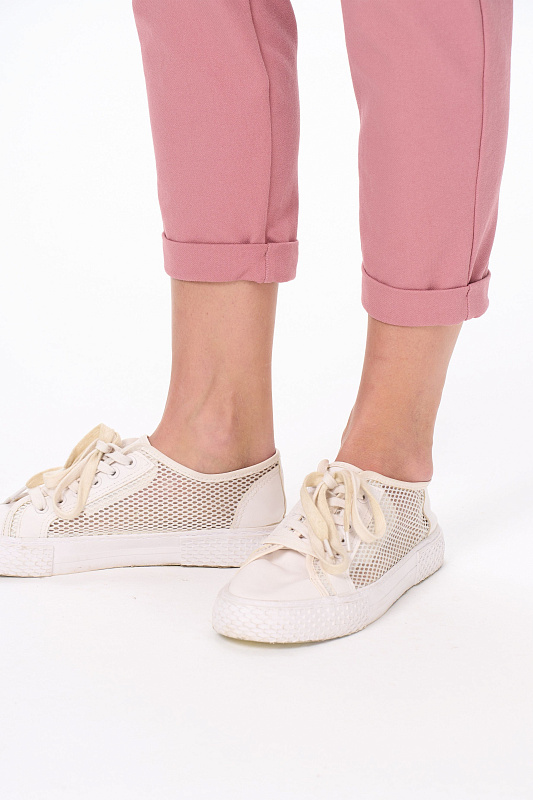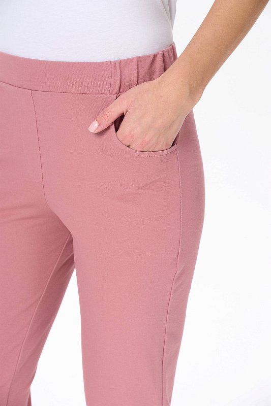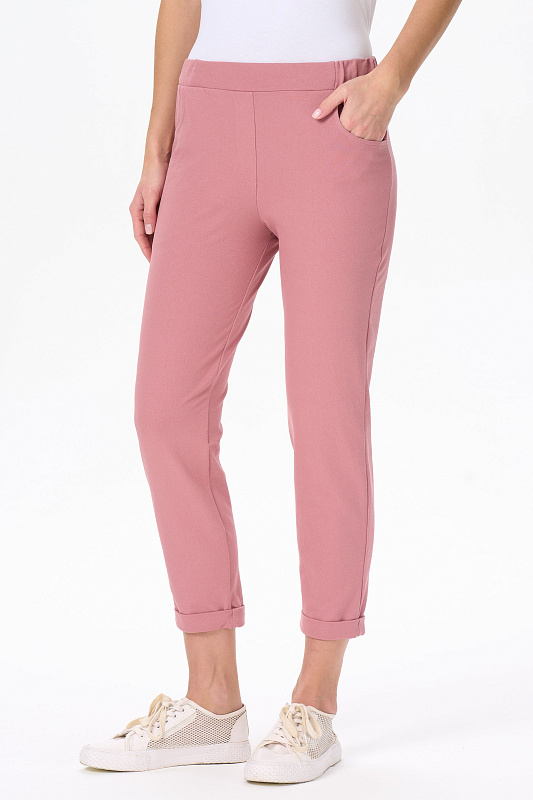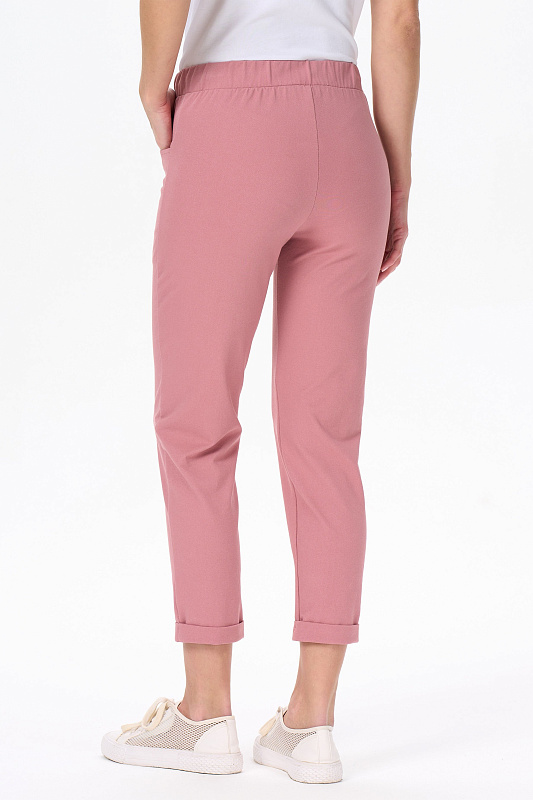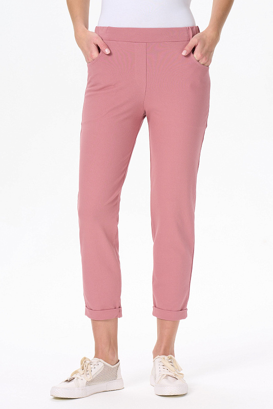 Зауженные брюки с карманами, из хлопкового полотна джинскотт. Пояс с планкой и эластичной лентой внутри. По низу брюк манжеты. Рост модели на фото 175