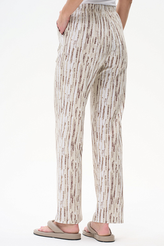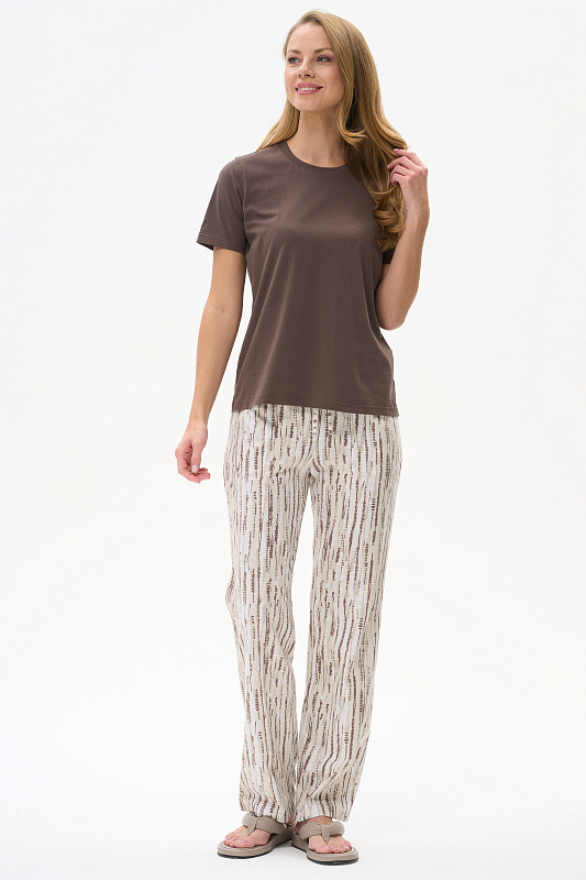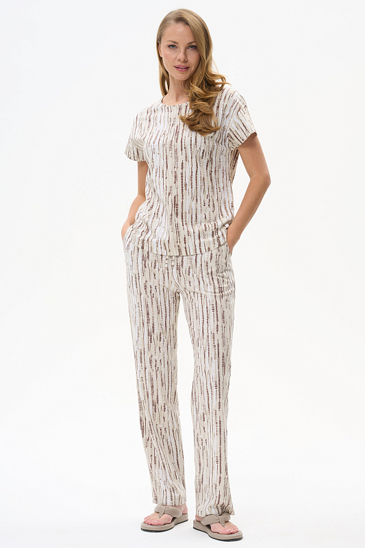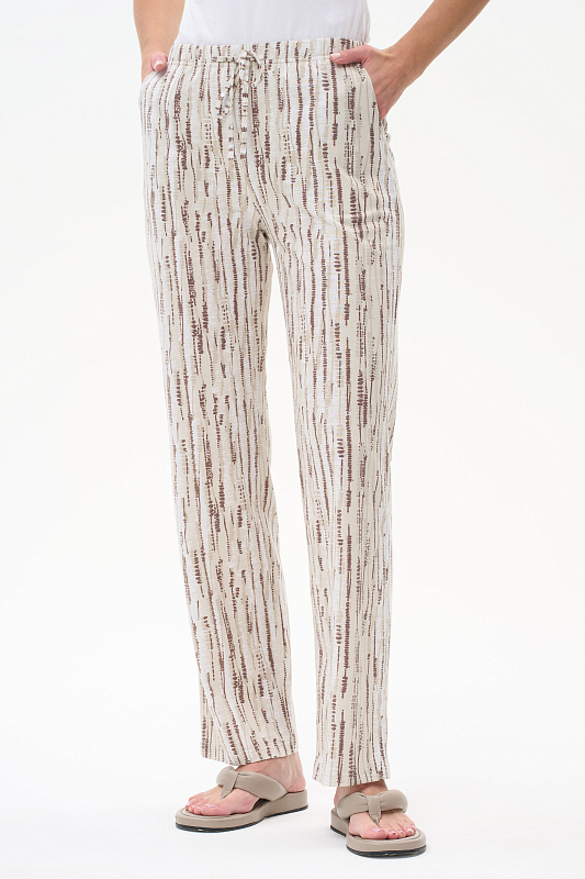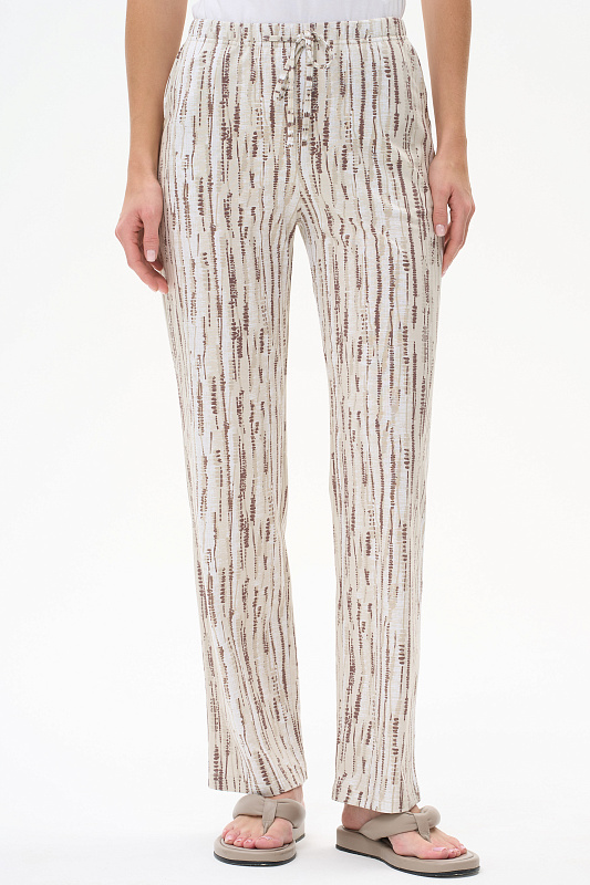 Длинные прямые брюки из кулирки 150 гр Вертикальная полоска в оттенках коллекции. Модель с фигурными карманами, цельнокроеный пояс с эластичной лентой внутри, завязки для регулировки посадки. Комфортная, лёгкая модель на жаркие дни. Рост модели 175 см.