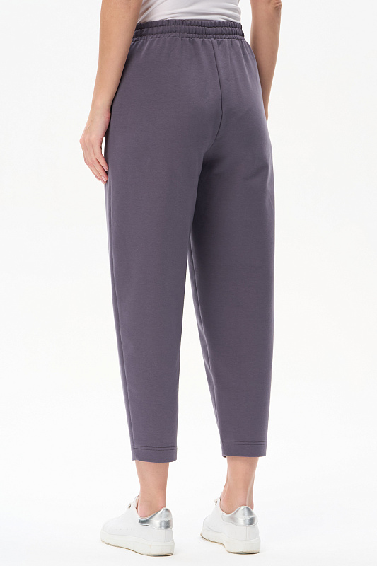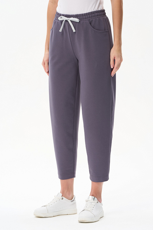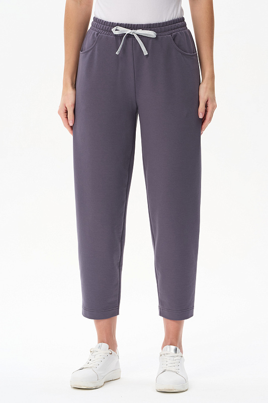 Брюки укороченные свободные выполнены из тонкого футера качества ПЕ 240 гр в трендовом оттенке Утренний туман. Модель с фигурными карманами, пояс с эластичной лентой внутри, красивый серебристый шнурок украшает модель и позволяет регулировать посадку.