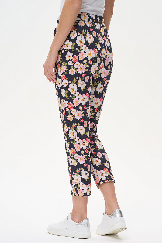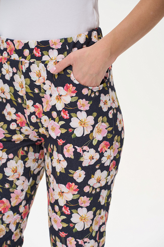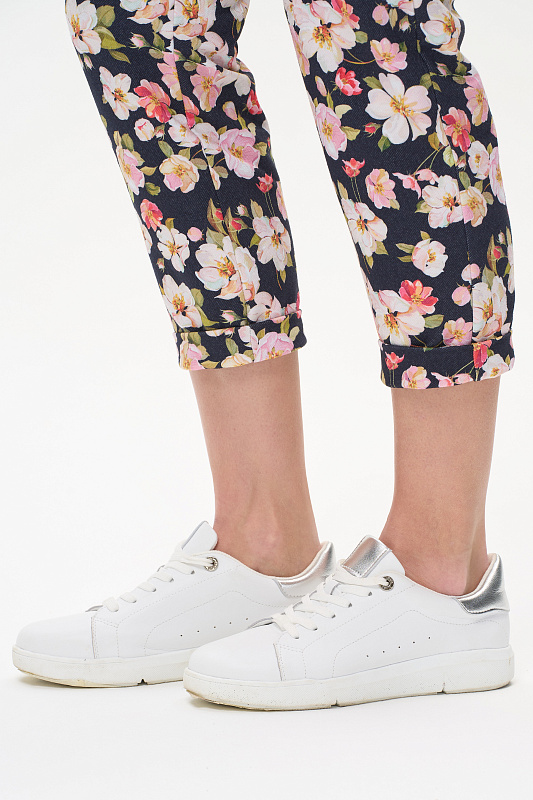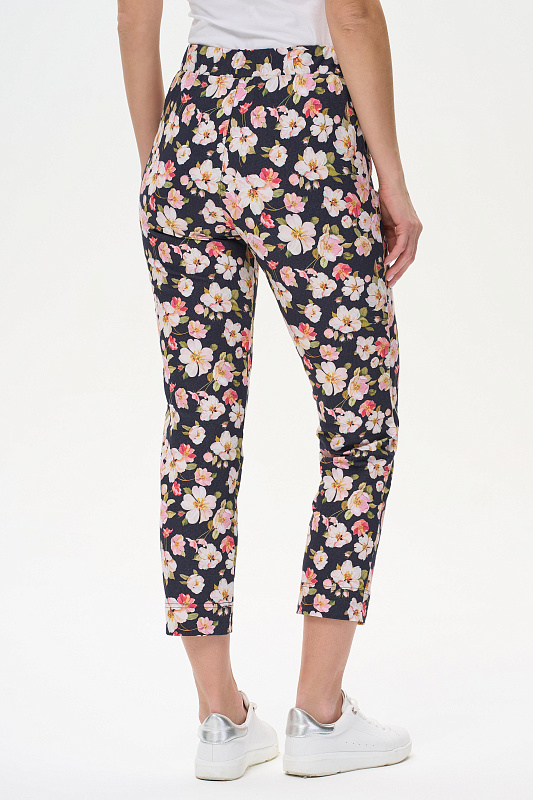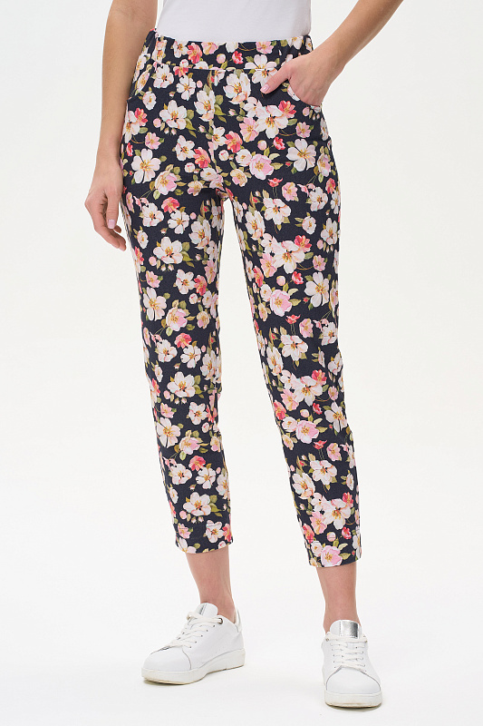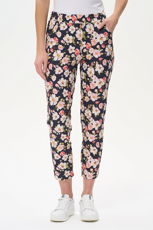 Брюки из хлопкового полотна джинскотт зауженного силуэта с карманами. Пояс с планкой и эластичной лентой внутри. Длина брюк регулируется подворотом. Длина по боковому шву в 44 размере - 88см. Рост модели на фото 177см