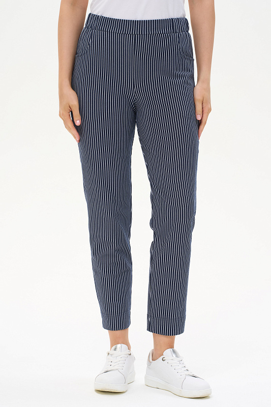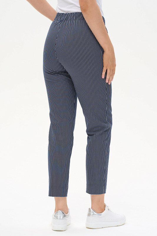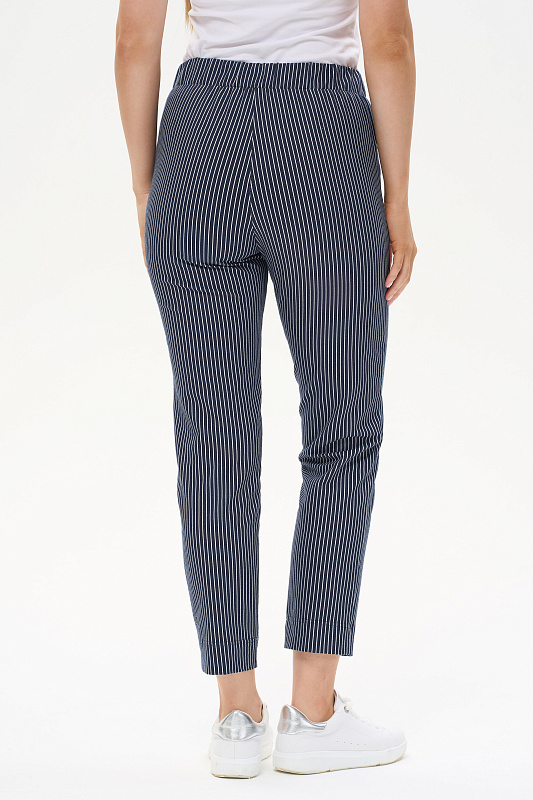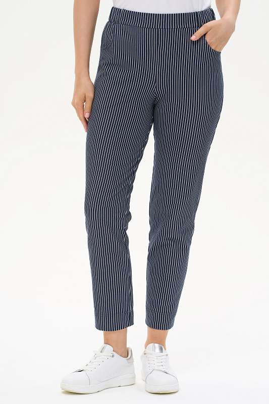 Укороченные брюки из джинскота 250 гр тонкая белая полоска на глубоком синем. Модель с комфортным прилеганием и идеальной посадкой. Зауженные к низу, фигурные карманы, пояс с мягкой эластичной лентой внутри. Длина регулируется отворотом по низу. Универсальная модель проверенная временем для городских образов, отдыха и путешествий. Рост модели 175 см.