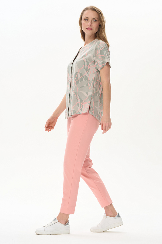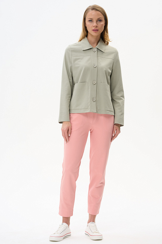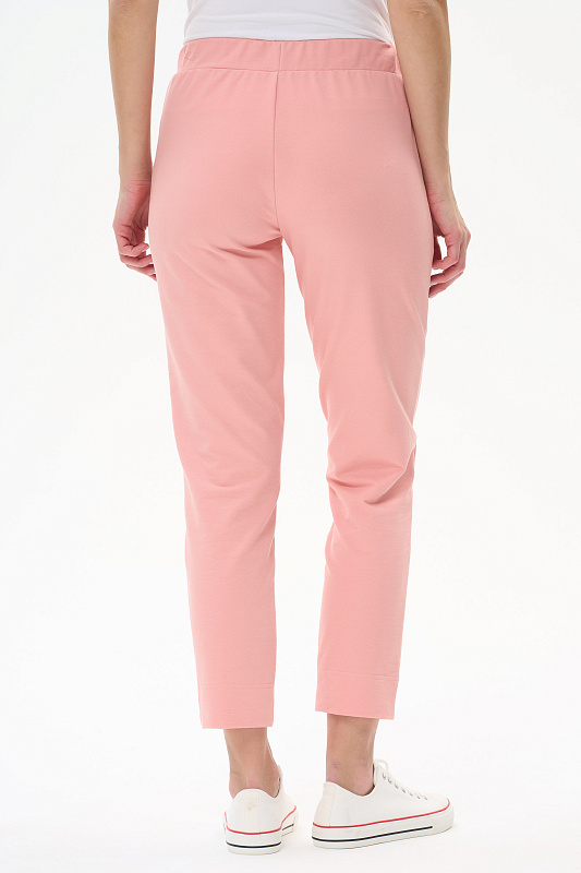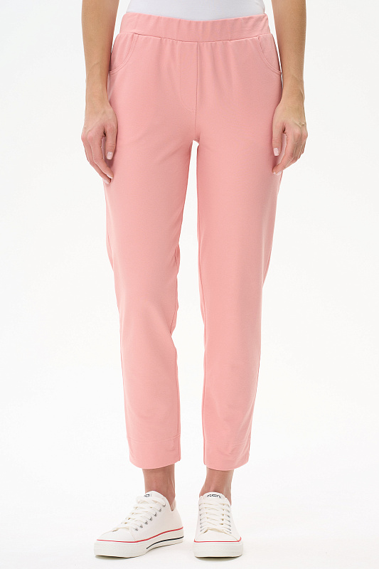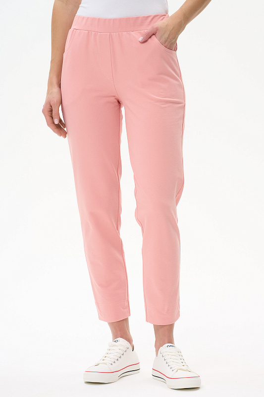 Зауженные брюки с карманами, из хлопкового полотна джинскотт. Пояс с эластичной лентой внутри. Длина брюк регулируется подворотом. Длина по боковому шву (без учета пояса) в 44 размере 88см. Рост модели 177