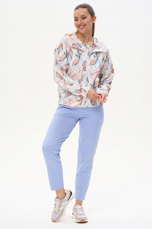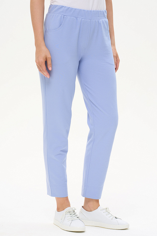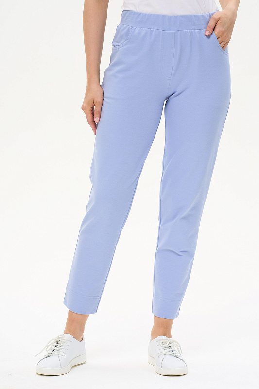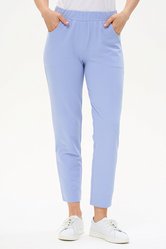 Зауженные брюки с карманами, из хлопкового полотна джинскотт. Пояс с эластичной лентой внутри. Длина брюк регулируется подворотом. Длина по боковому шву (без учета пояса) в 44 размере 88см. Рост модели 177