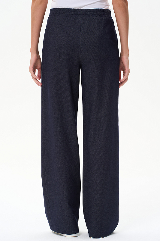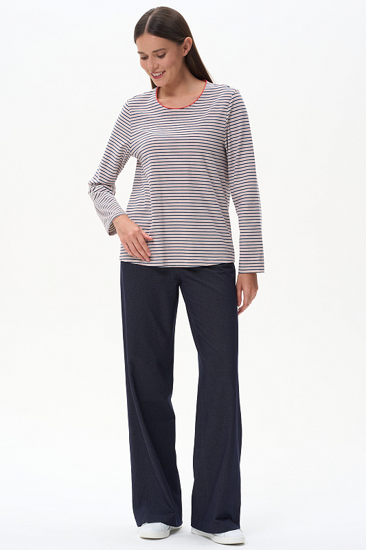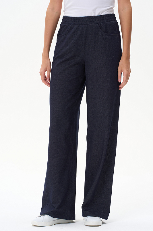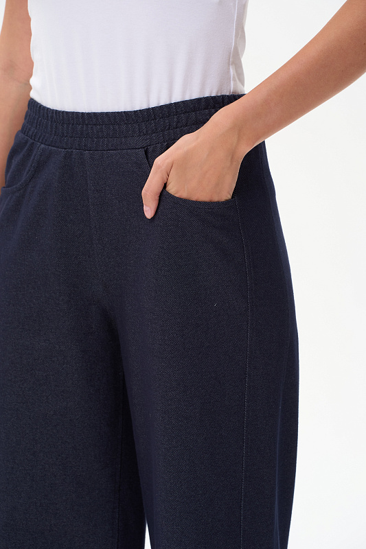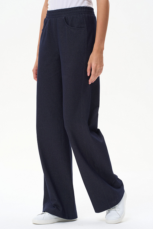 Прямые брюки полной длины с высокой посадкой. Вставки в боковых швах (лампасы), спереди фигурные карманы, пояс с эластичной лентой внутри, отстрочки в тон полотна. Благодаря конструкции брюк модель идеально сидит на фигуре и зрительно "вытягивает" ноги. Рост модели 175 см.