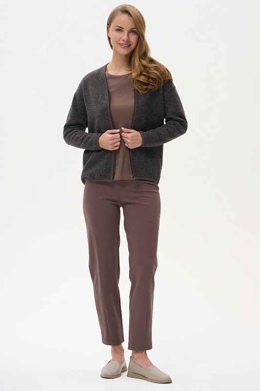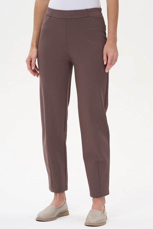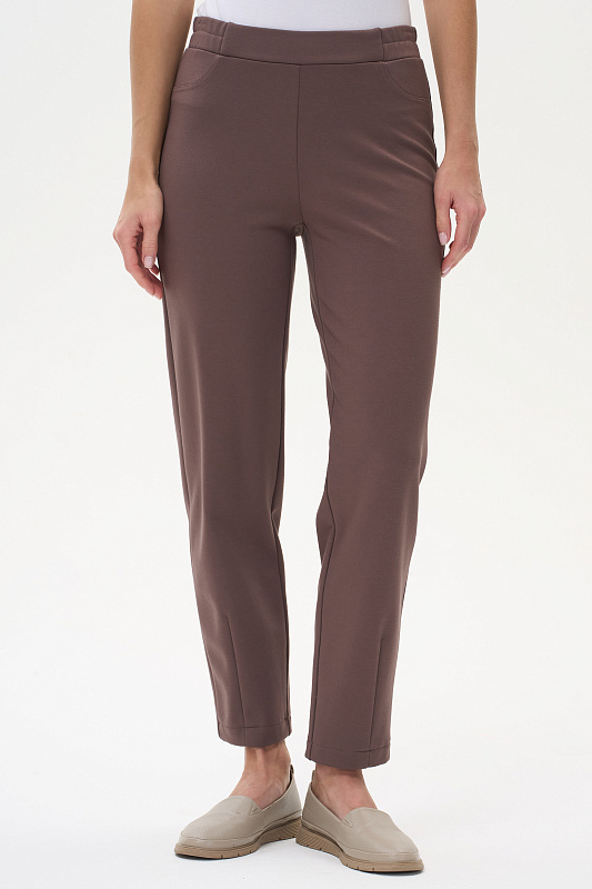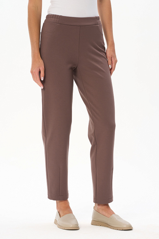 Утеплённые брюки из вискозного полотна бистрейч с начесом с добавлением пэ и эластана 400 гр в кофейном оттенке. Модель немного укороченная, зауженная к низу с вытачкой по низу спереди для придания модного силуэта. Брюки с высокой посадкой, пояс с планкой и эластичной лентой внутри, сзади два накладных кармана. Тёплая, комфортная модель для осени. Длина в 44р - 97 см. Рост модели 175 см.