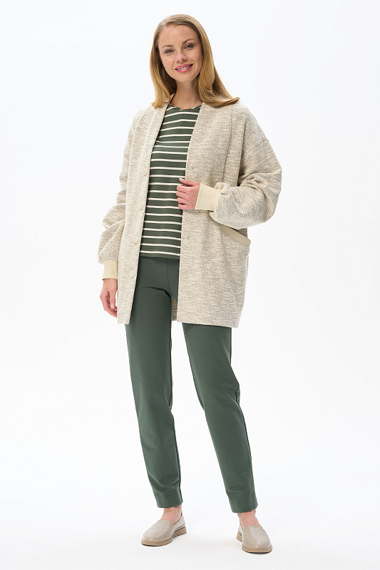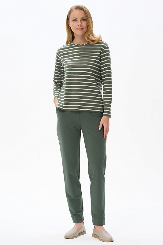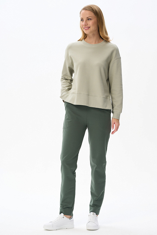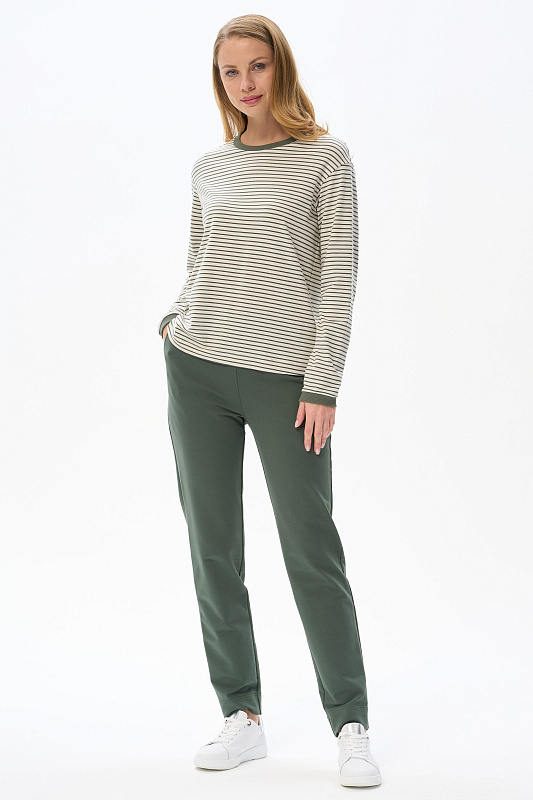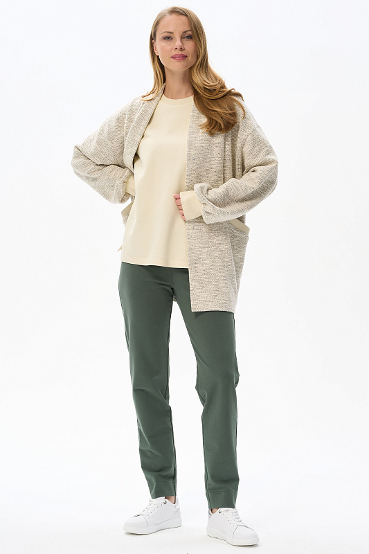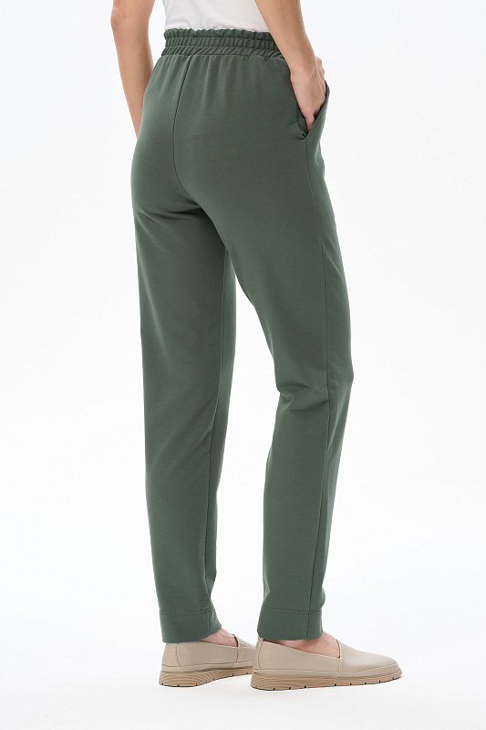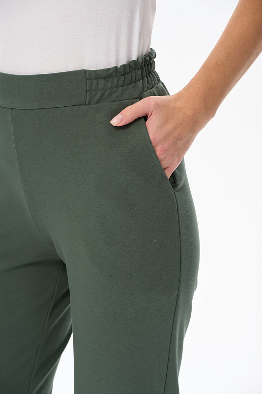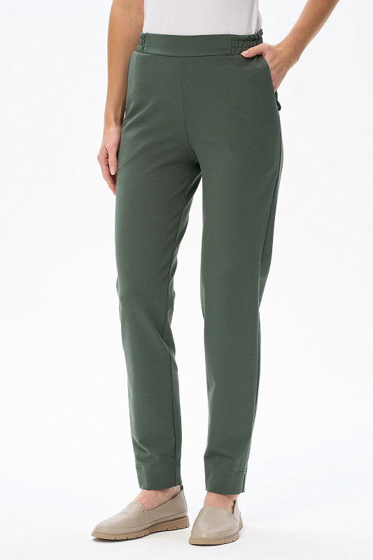 Зауженные брюки с карманами из хлопкового полотна футер (без начеса). Пояс с планкой и эластичной лентой внутри. Длина брюк регулируется подворотом. Длина по боковому шву (без учета пояса) в 44 размере - 98см. Рост модели 178 см.