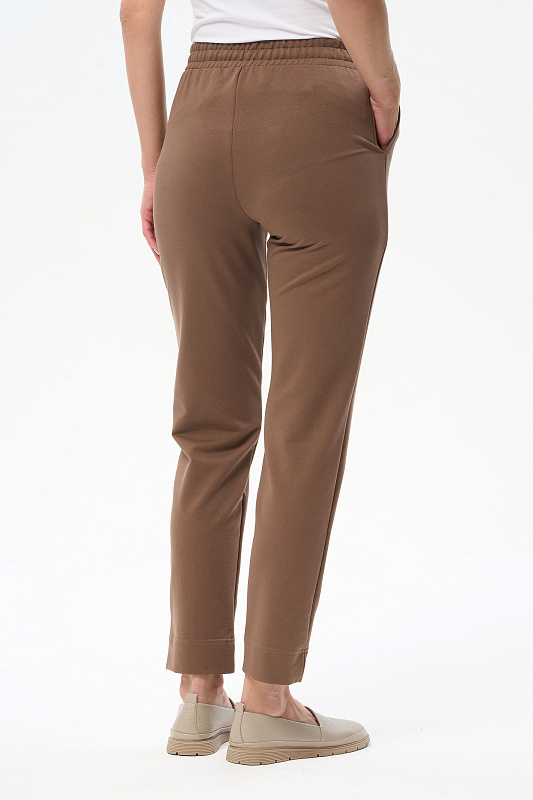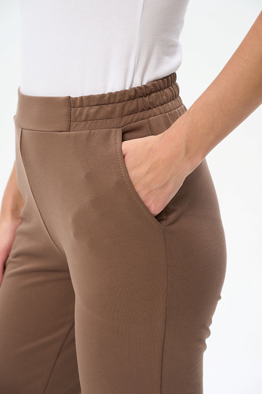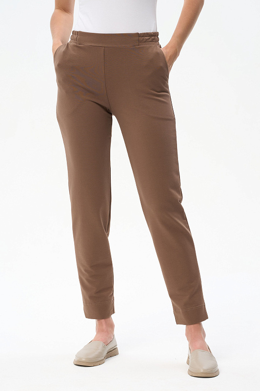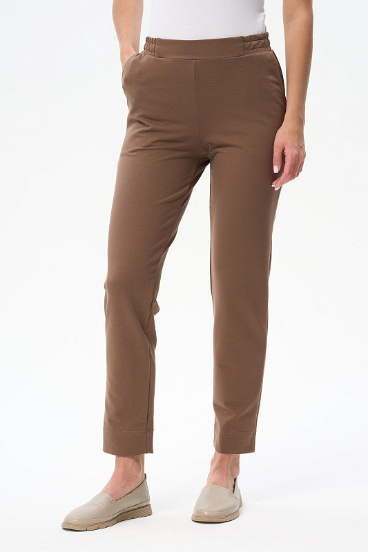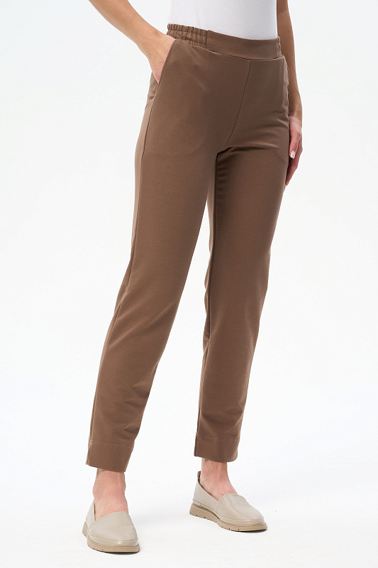 Зауженные брюки с карманами из хлопкового полотна футер (без начеса). Пояс с планкой и эластичной лентой внутри. Длина брюк регулируется подворотом. Длина по боковому шву (без учета пояса) в 44 размере - 98см. Рост модели 178 см.