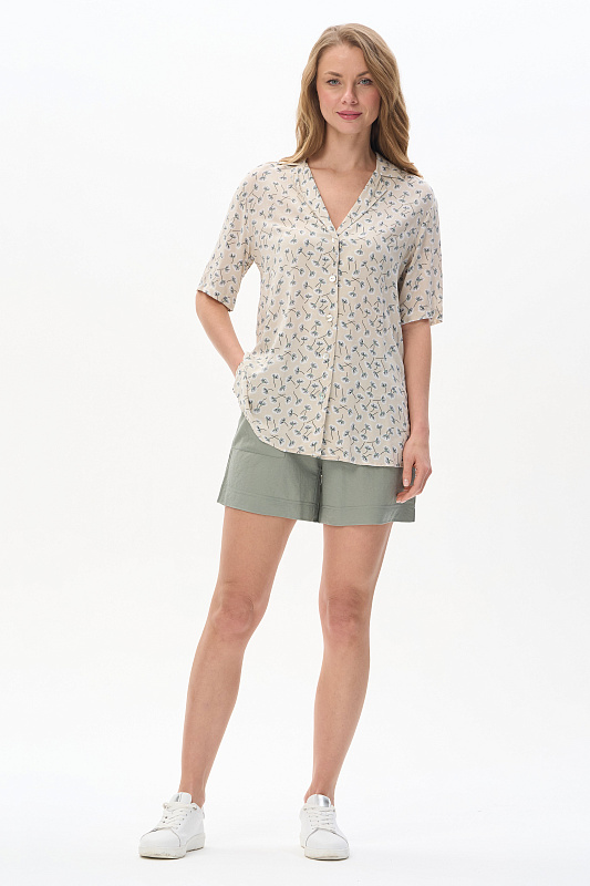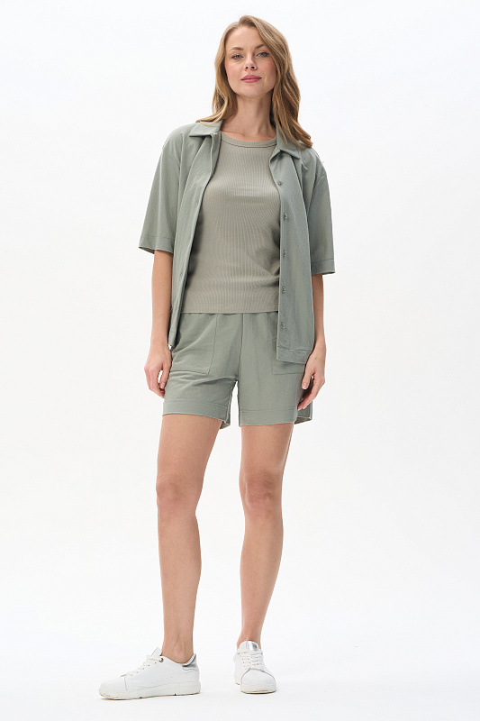 Шорты из вискозного полотна с добавлением ПЭ 180 гр, лёгкое, струящееся, фактурное в оттенке Полынь. Модель свободная, с накладными карманами, пояс с эластичной лентой внутри. Комфортная модель для отдыха, города, путешествий. Длина в 44 р - 40 см. Рост модели 175 см.