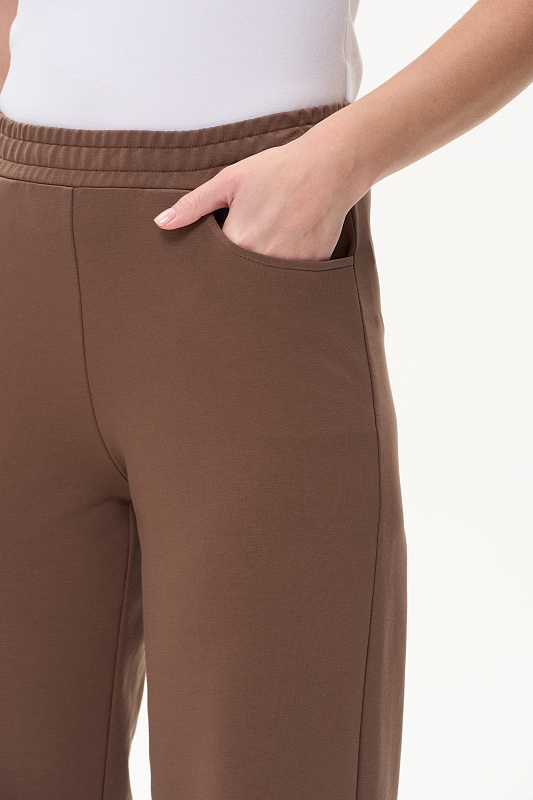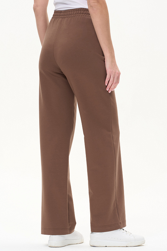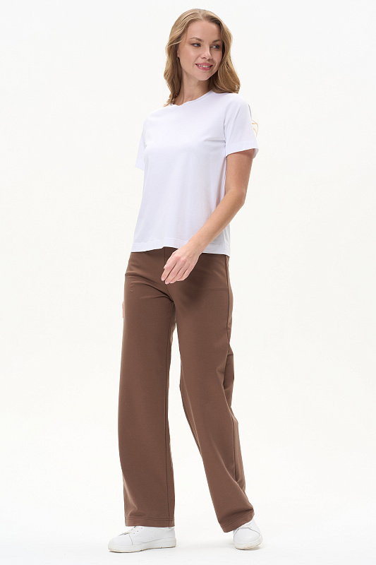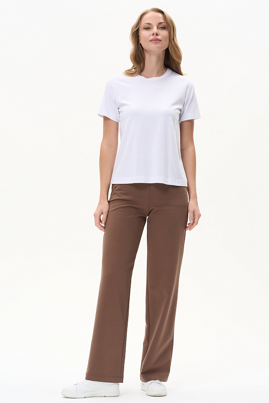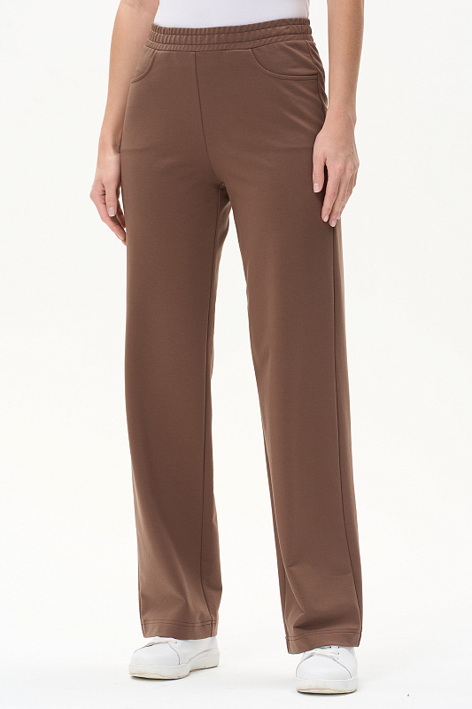 Повседневные, прямые брюки с карманами из хлопкового полотна френчтерри. Пояс выполнен из основного полотна с эластичной лентой внутри. По бокам фигурные карманы. Длина брюк по боковому шву (без пояса) в 44 размере - 104 см. Рост модели 175 см.