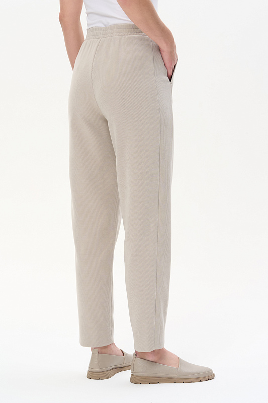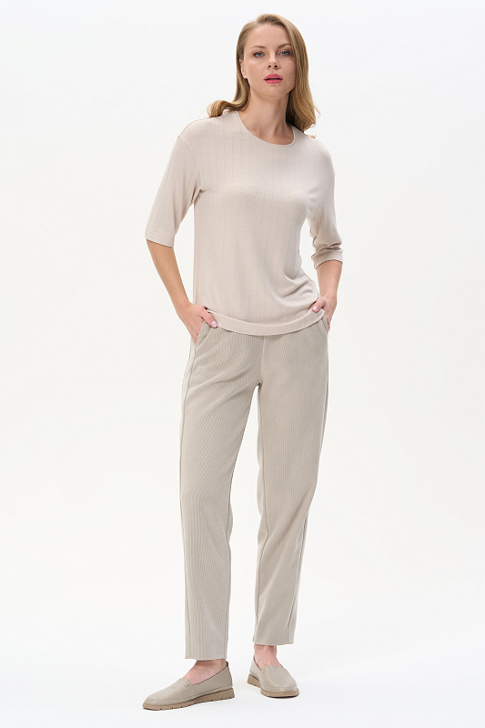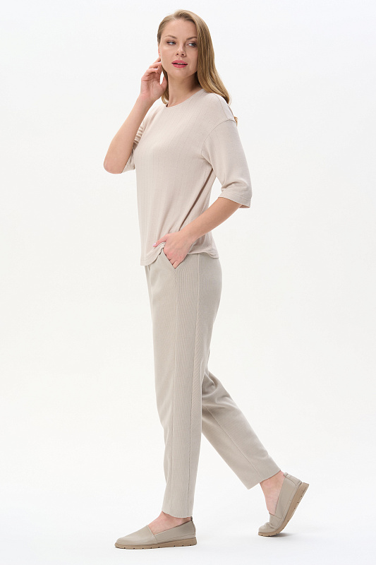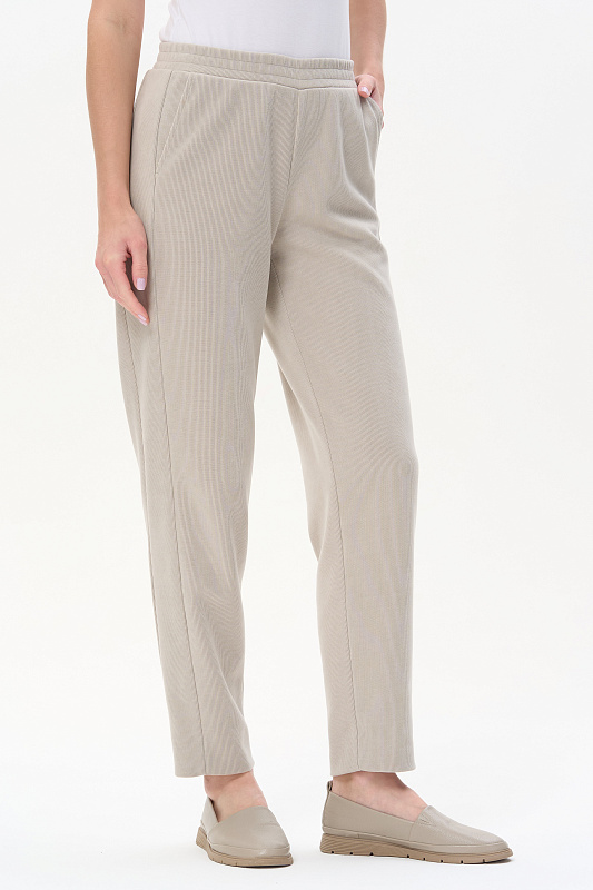 Брюки-бананы из вискозного трикотажного вельвета в мелкий рубчик 420 гр. в Серо-бежевом оттенке.. Модель с высокой комфортной посадкой, с модными боковыми вставками, с классическими карманами, широкий пояс с эластичной лентой и отстрочкой в тон. Прекрасная трендовая модель на осень, легко сочетается со всеми верхами коллекции. Длина по боковому шву в 44 р - 102 см. Рост модели 175 см.