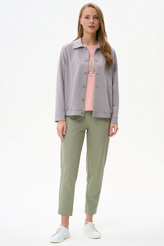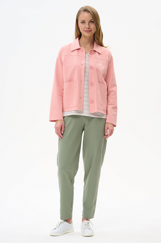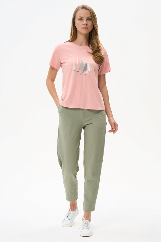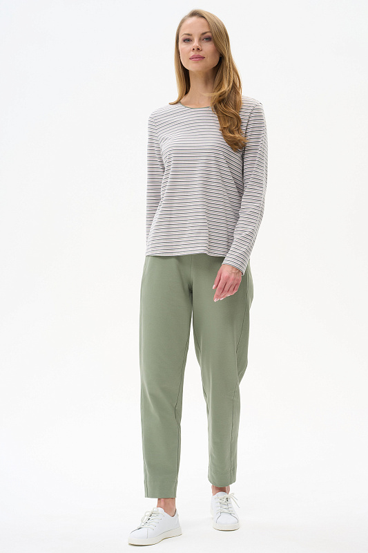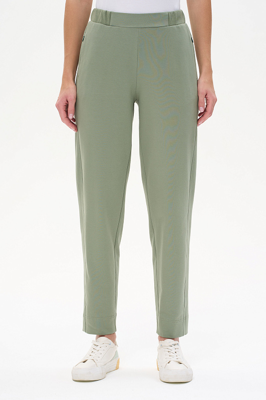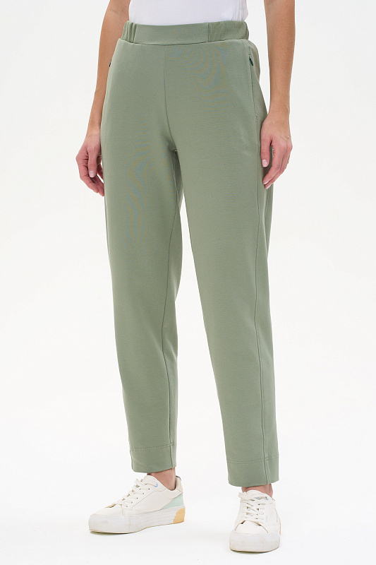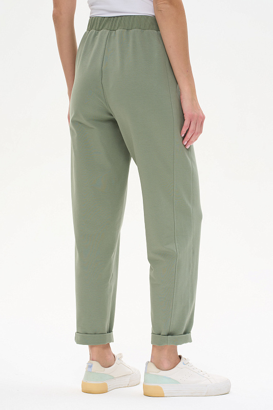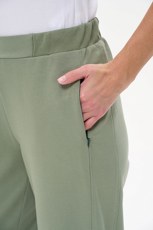 Брюки-бананы с рельефными вставками. Выполнены из футера 2-х нитки с эластаном. Пояс с эластичной тесьмой. В рельефных швах карманы с потайной молнией. Длина по боковому шву в 44 размере 100см. Рост модели на фото 178см.