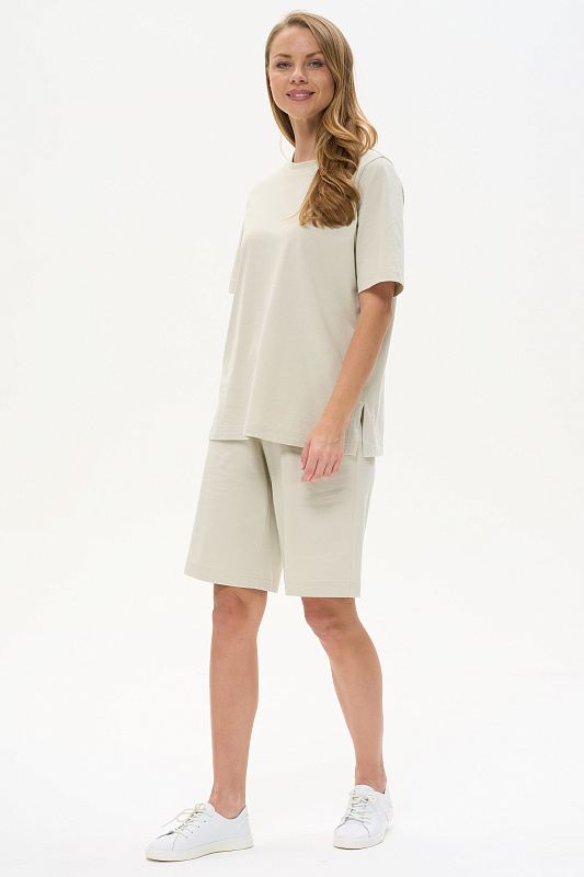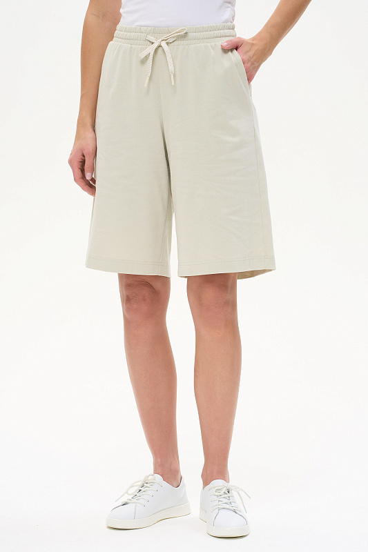 Удлинённые шорты из кулирки ПЕ180 гр красивого серо-зелёного светлого оттенка. Модель свободная, прямого силуэта, отрезной пояс с эластичной лентой внутри, боковые карманы, красивый серебристый шнурок украшает модель и позволяет регулировать посадку. Удобные, лёгкие шорты для отдыха, дома и путешествий. Длина по боковому шву в 44 р - 55см. Рост модели 175 см.
