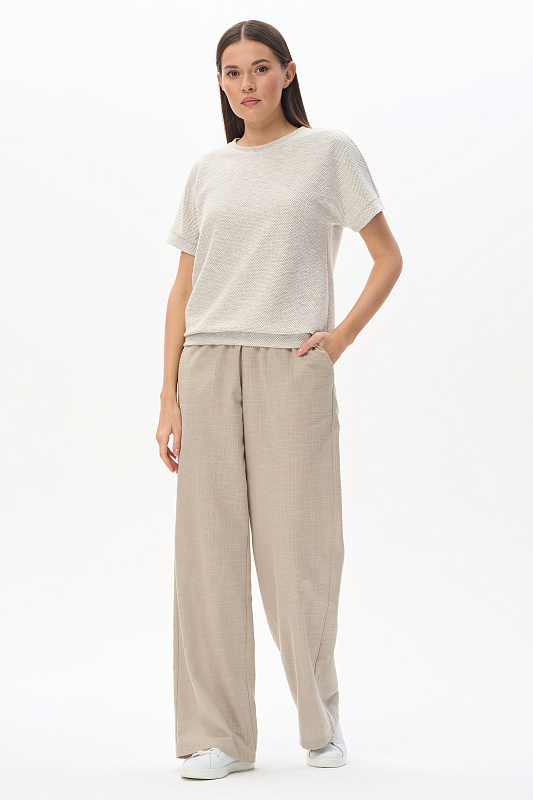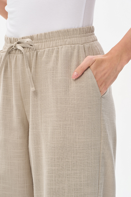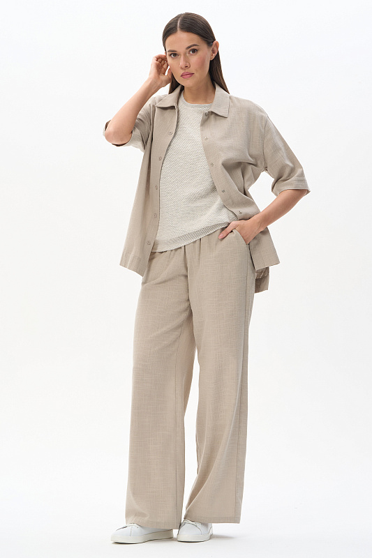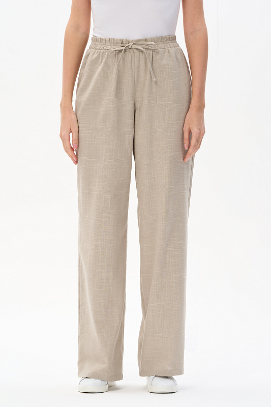 Прямые свободные брюки из хлопковой фактурной ткани 120 гр в серо-зелёном оттенке. Модель полной длины, классические карманы в боковом шве, пояс с эластичной лентой внутри, завязки для регулировки посадки. Лёгкая модель на жаркие дни, незаменима в качестве офисного варианта для лета. В паре с жилетом из той же ткани создают элегантный комплект. Рост модели 175 см.