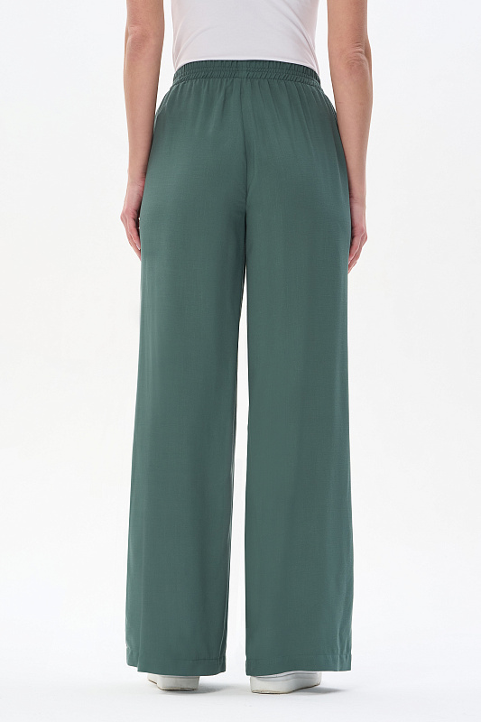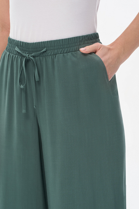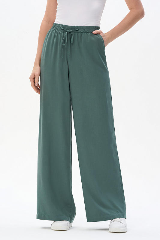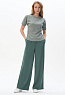 Прямые свободные брюки полной длины из штапельной вискозной ткани 150 гр, мягкая, с бархатистым эффектом, тактильно приятная, в оттенке Серебристая сосна. Классические карманы в боковом шве, пояс с эластичной лентой внутри, завязки для регулировки посадки. Комфортная, лёгкая модель на жаркие дни. Благодаря благородному оттенку выглядят дорого и подходят к большому количеству верхов в коллекции. Рост модели 175 см.