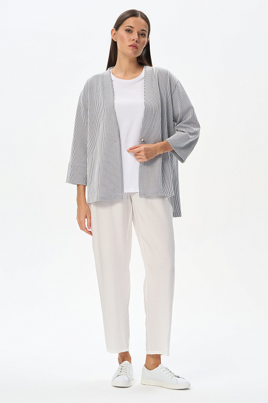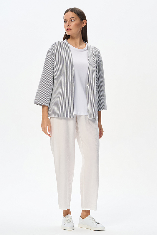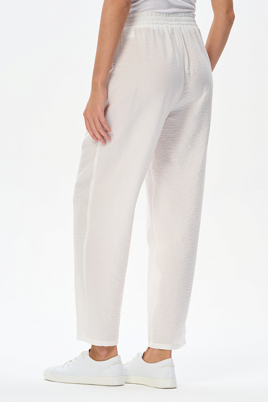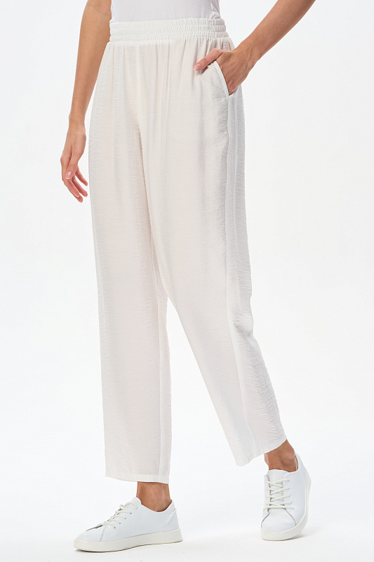 Зауженные брюки из лёгкой плательной ткани 120 гр в трендовом оттенке Белый песок. Модель свободная, укороченная, классические карманы в боковом шве, пояс с эластичной лентой внутри. Комфортная, лёгкая модель на жаркие дни. Благодаря оттенку подходят ко многим изделиям коллекции. Универсальная модель для офиса, отдыха, путешествий. Рост модели 175 см.