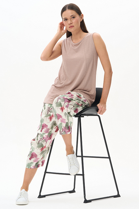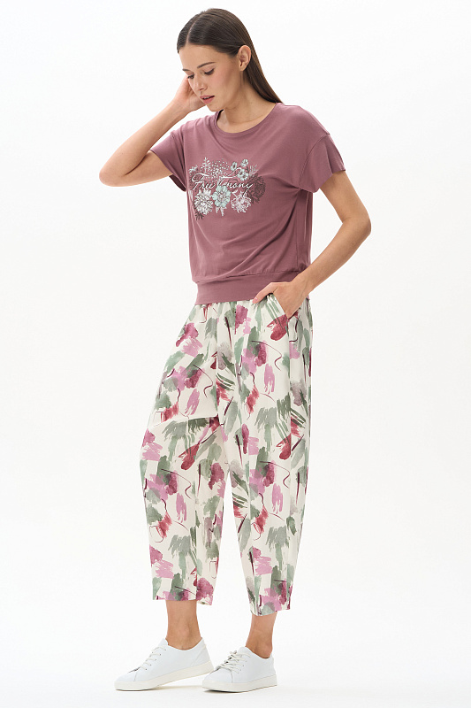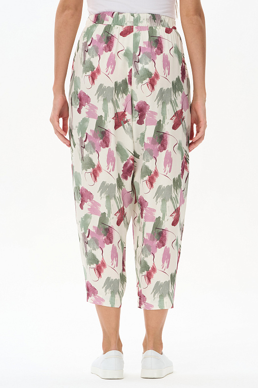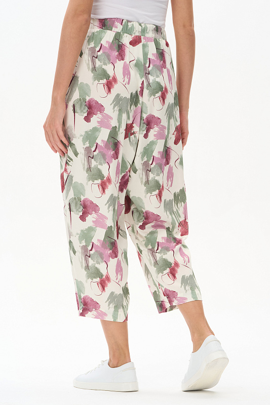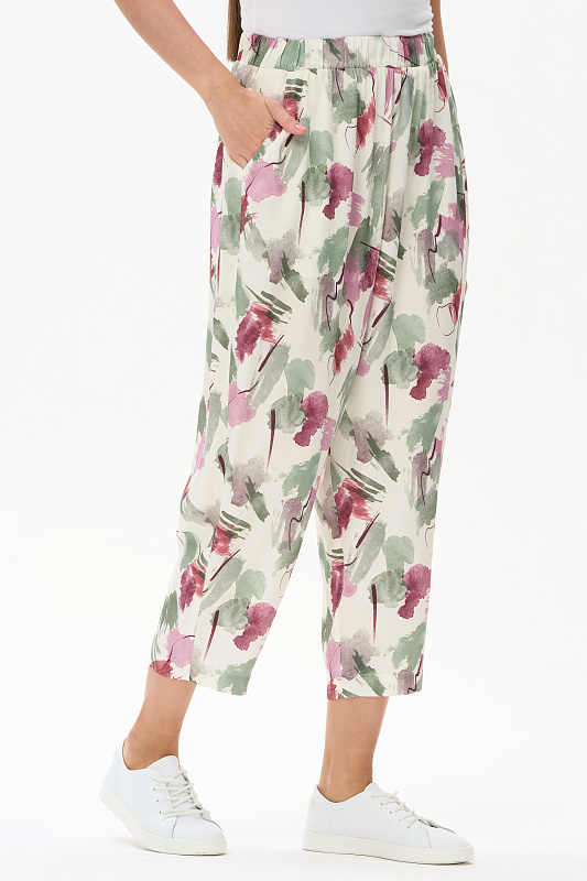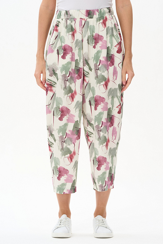 Брюки из легкой штапельной ткани 120 гр с Абстрактным рисунком в оттенках коллекции. Модель модного "О" силуэта, свободные, укороченные, с заниженным средним швом. Классические карманы, широкий пояс с эластичной лентой внутри. Отличная модель для стильных летних образов, Рост модели 175 см.